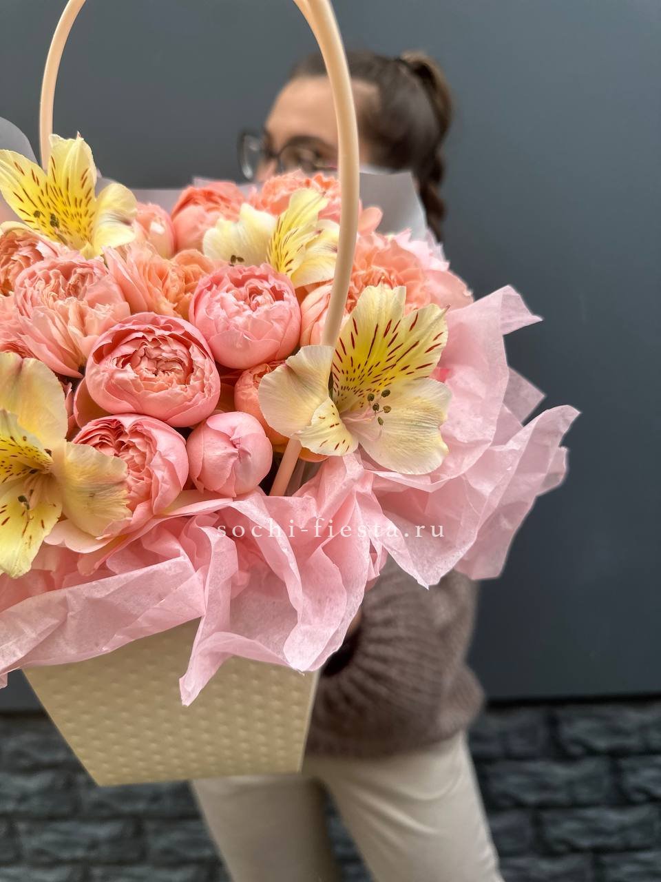 Состав: пионовидные кустовые розы, альстромерии, сумочка, лента.