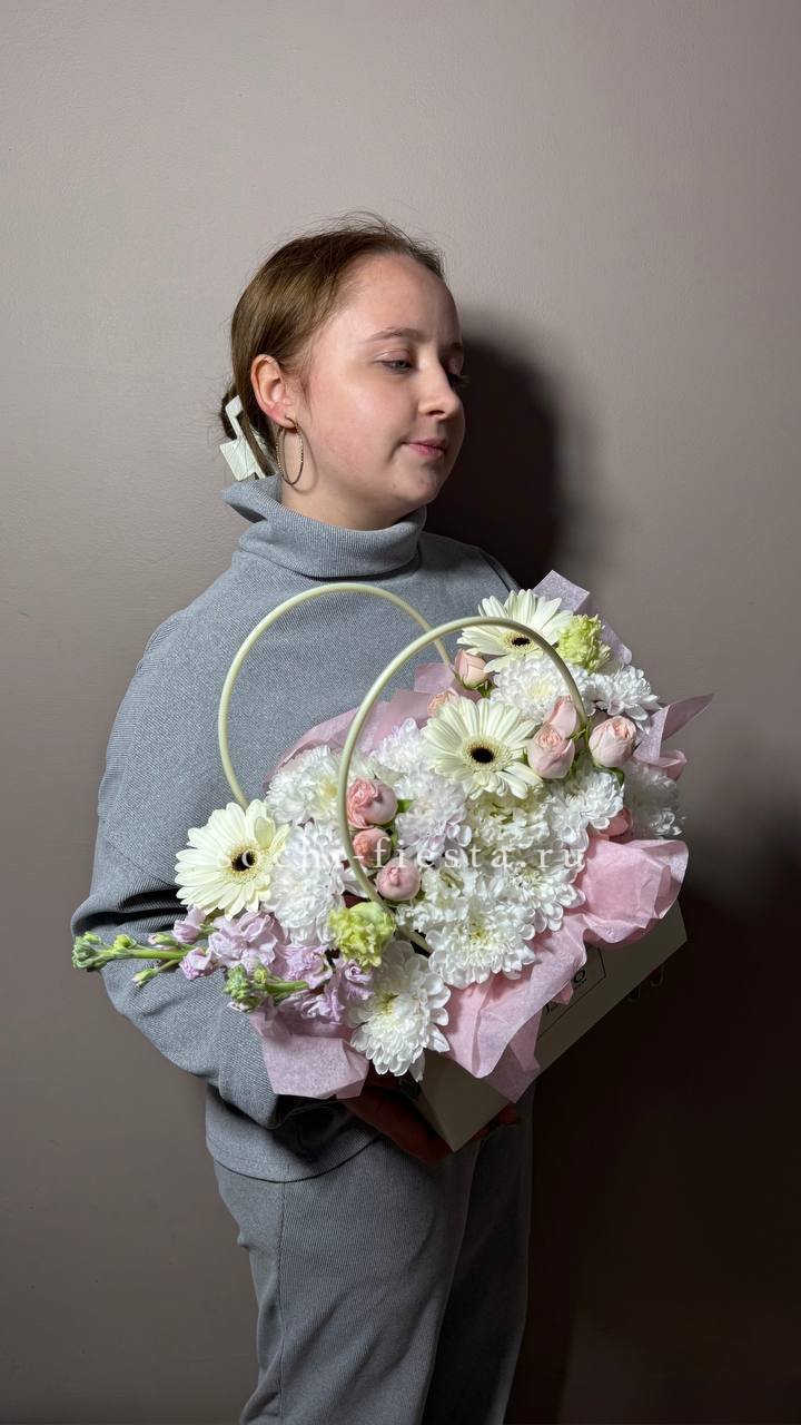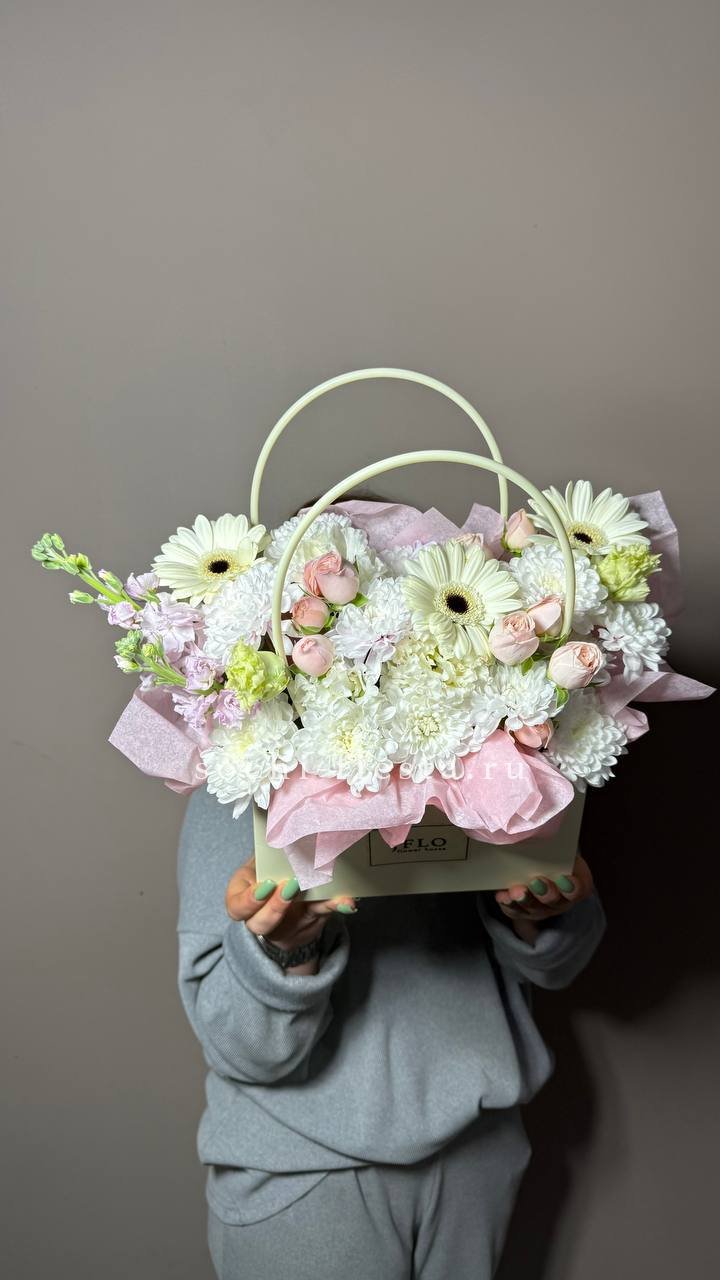 Состав: хризантема, маттиола, гербера, бомбастик, эустома, сумочка