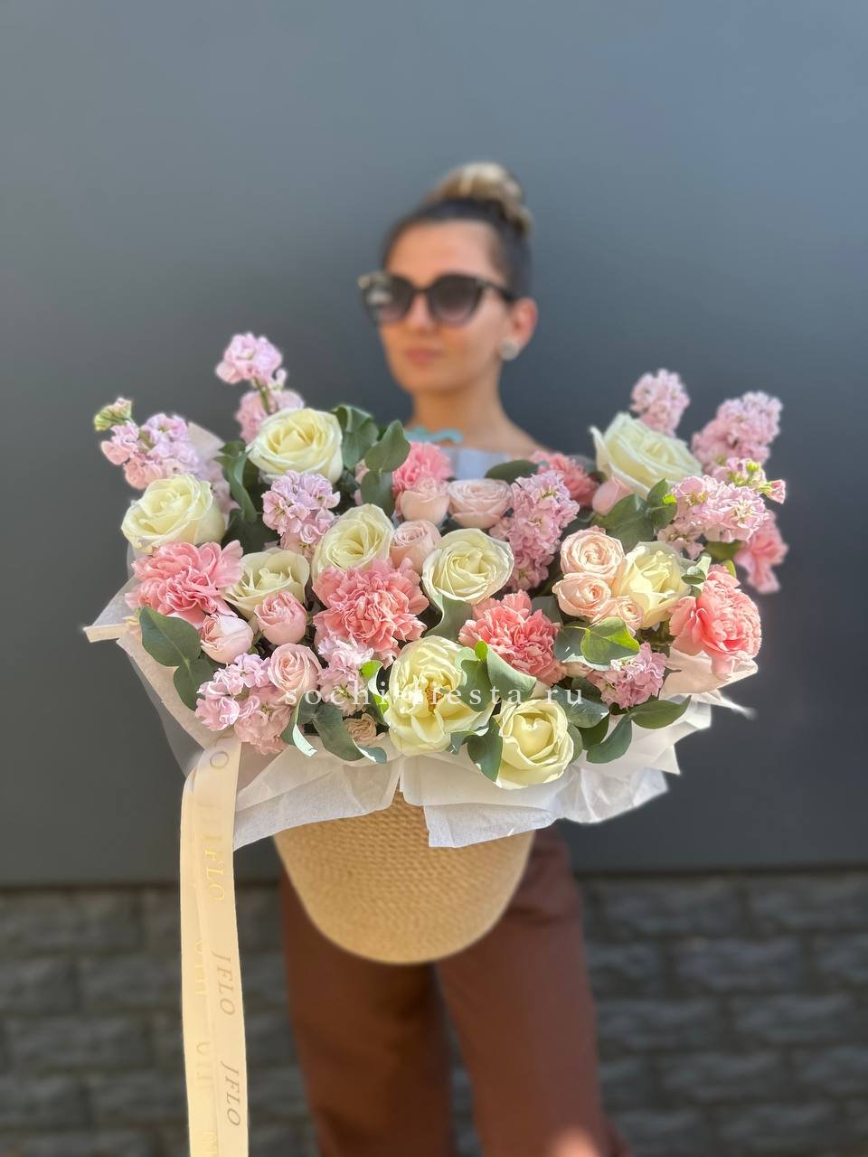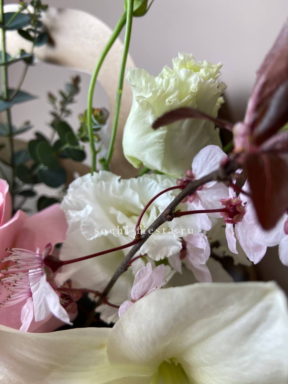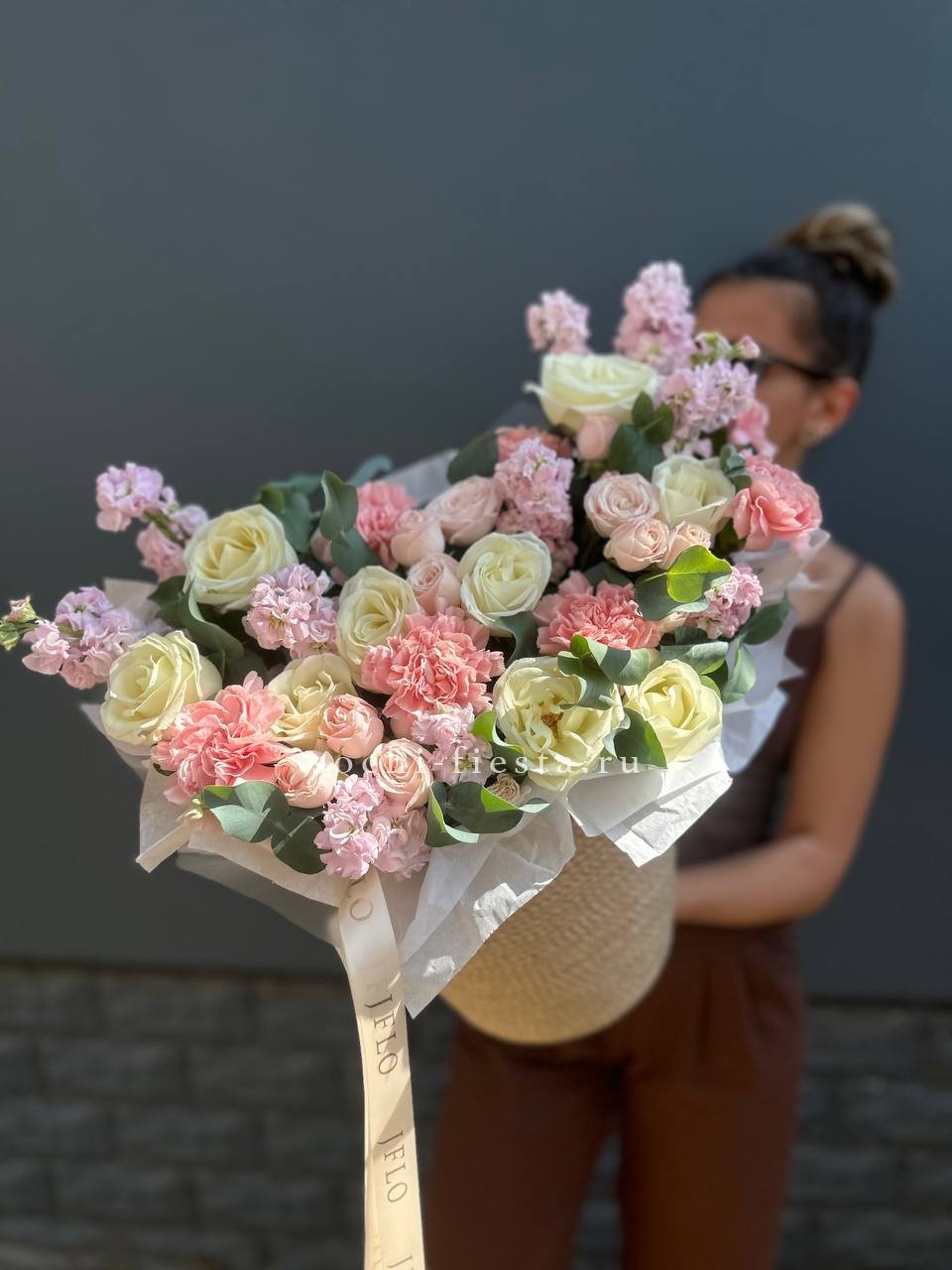 Состав: розовая роза, хризантема, хлопок, антирринум, диантус