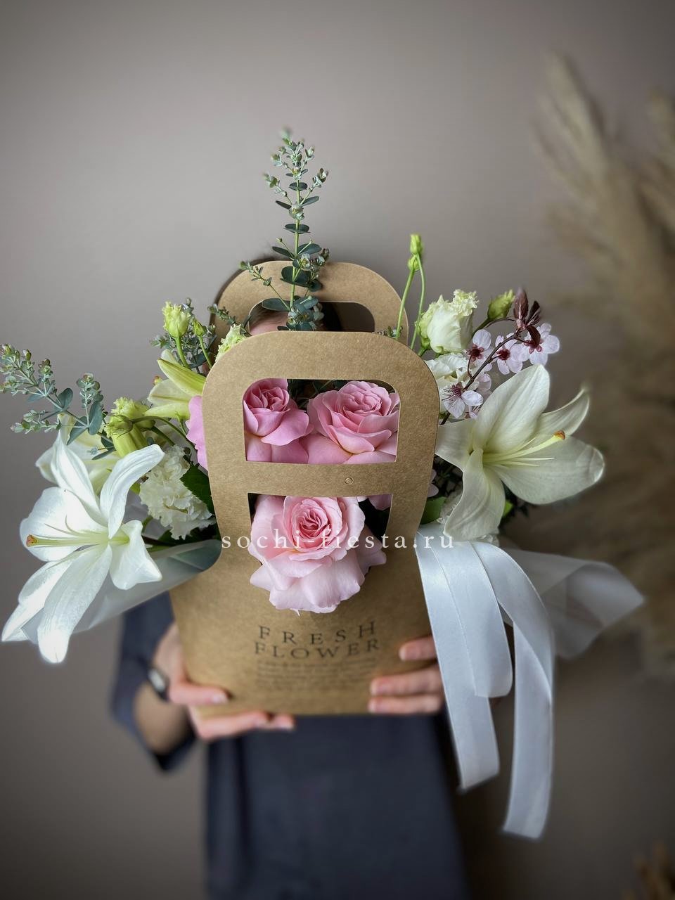 Воплощение изысканности и тренда! Эта стильная композиция в розовой сумочке объединяет в себе яркие цветовые акценты и современный флористический дизайн. Она идеально подойдет для модного образа или в качестве креативного подарка для ценителей необычных решений. Безупречный вкус в каждой детали.