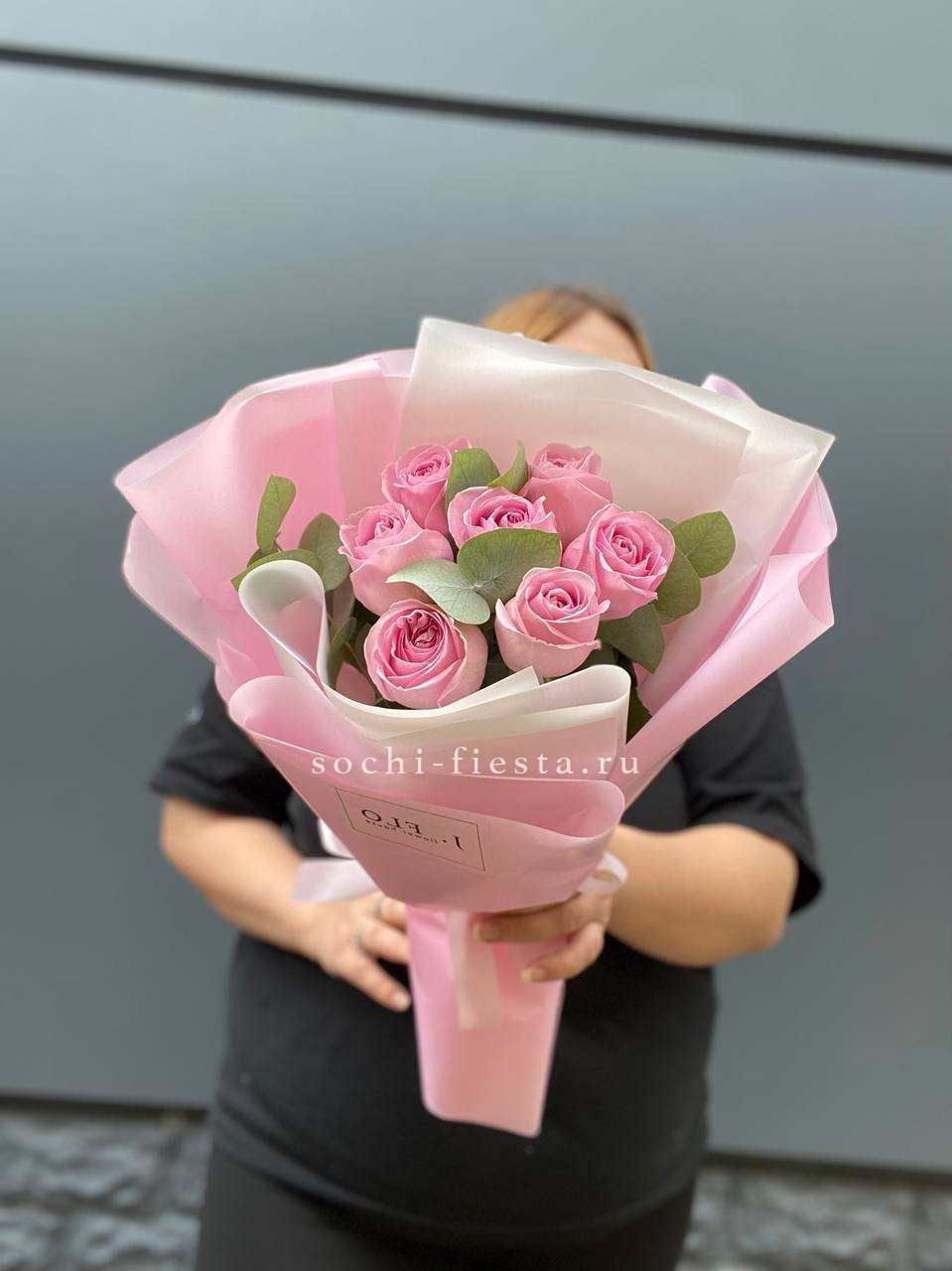 Состав: розовая роза - 7 шт., эвкалипт синереа, лента, авторское оформление.
