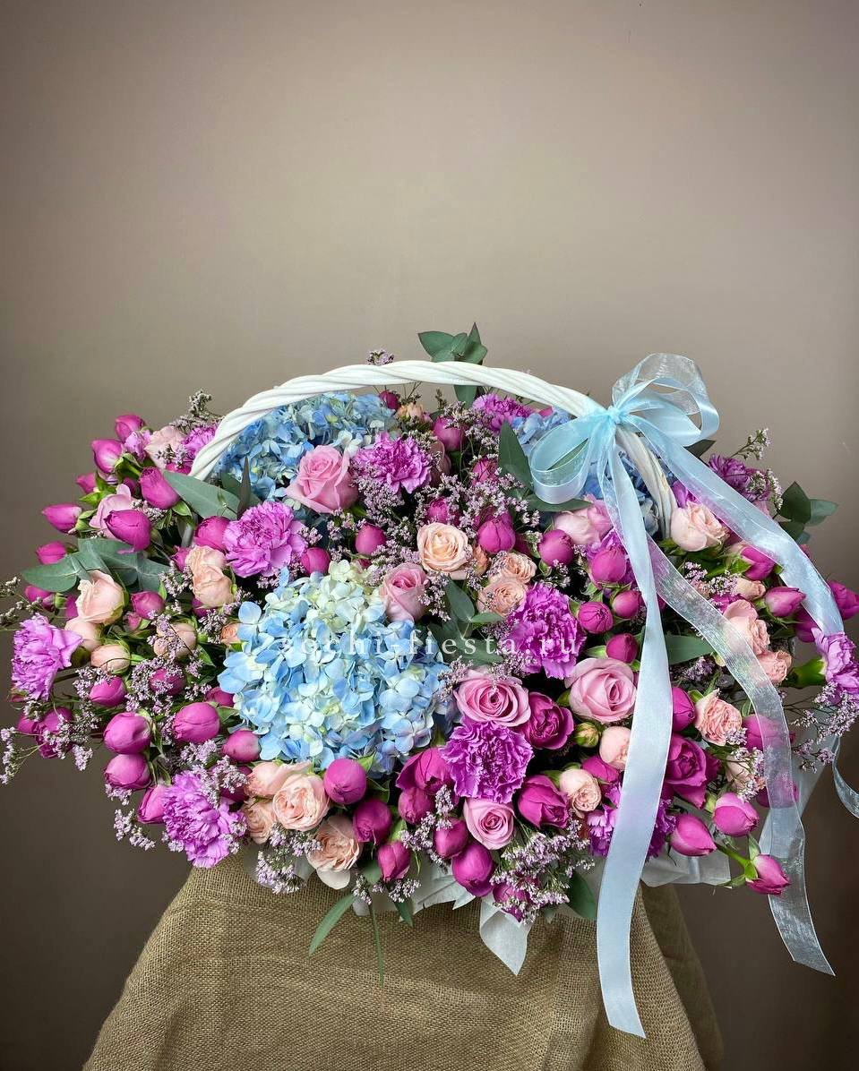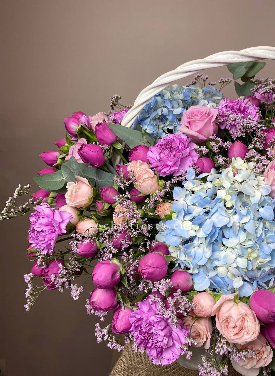Состав: гортензия, кустовые розы, розы, лимониум, эвкалипт, лента, корзина D40