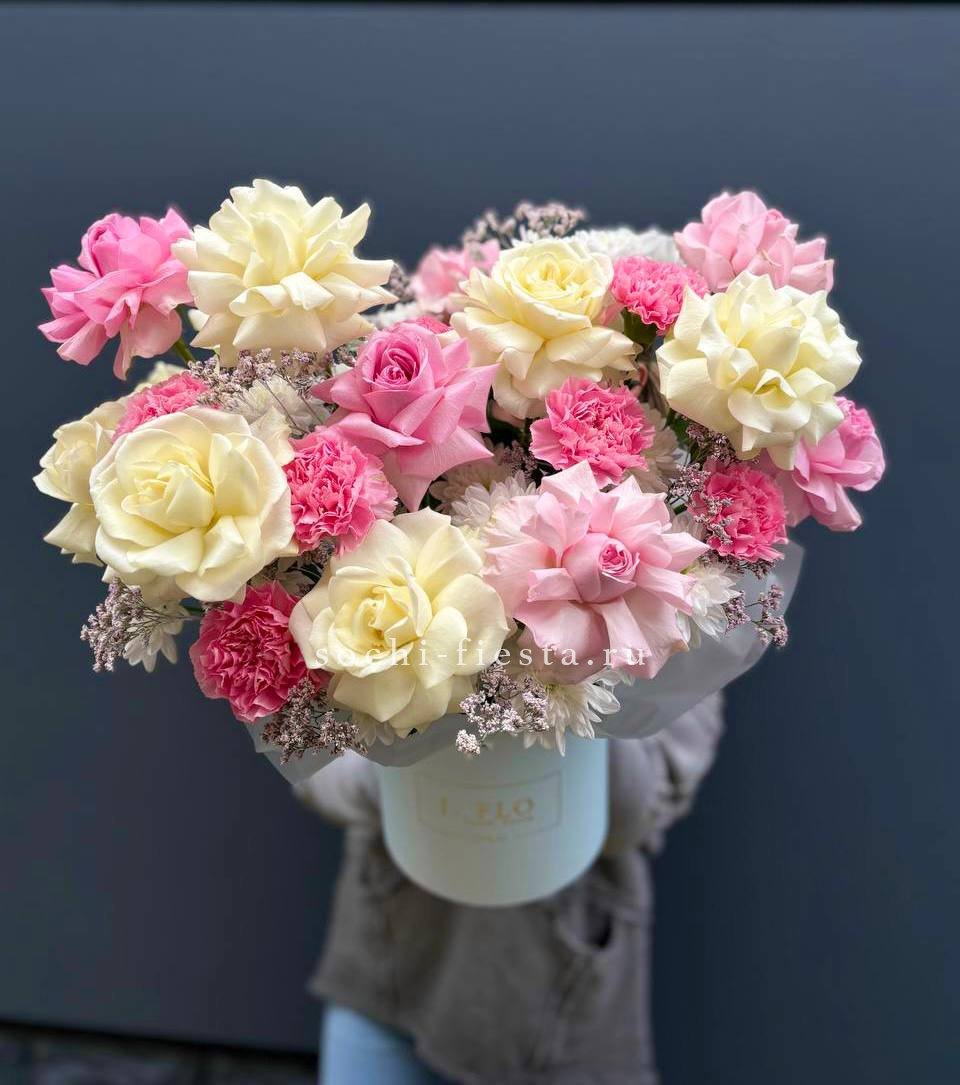 Состав: корзина из нежных цветов диантусов, роз, эустомы
