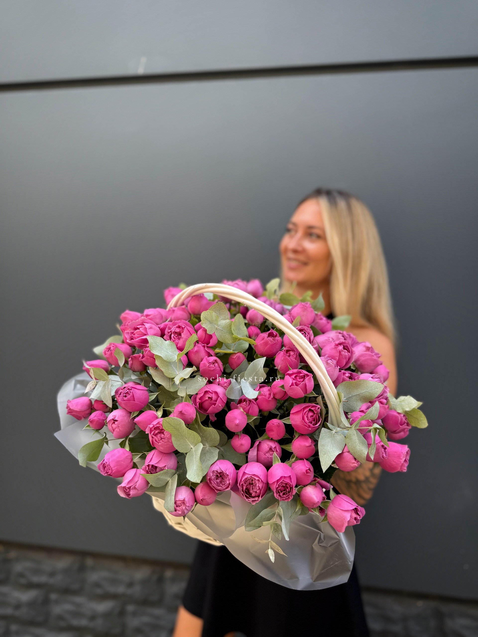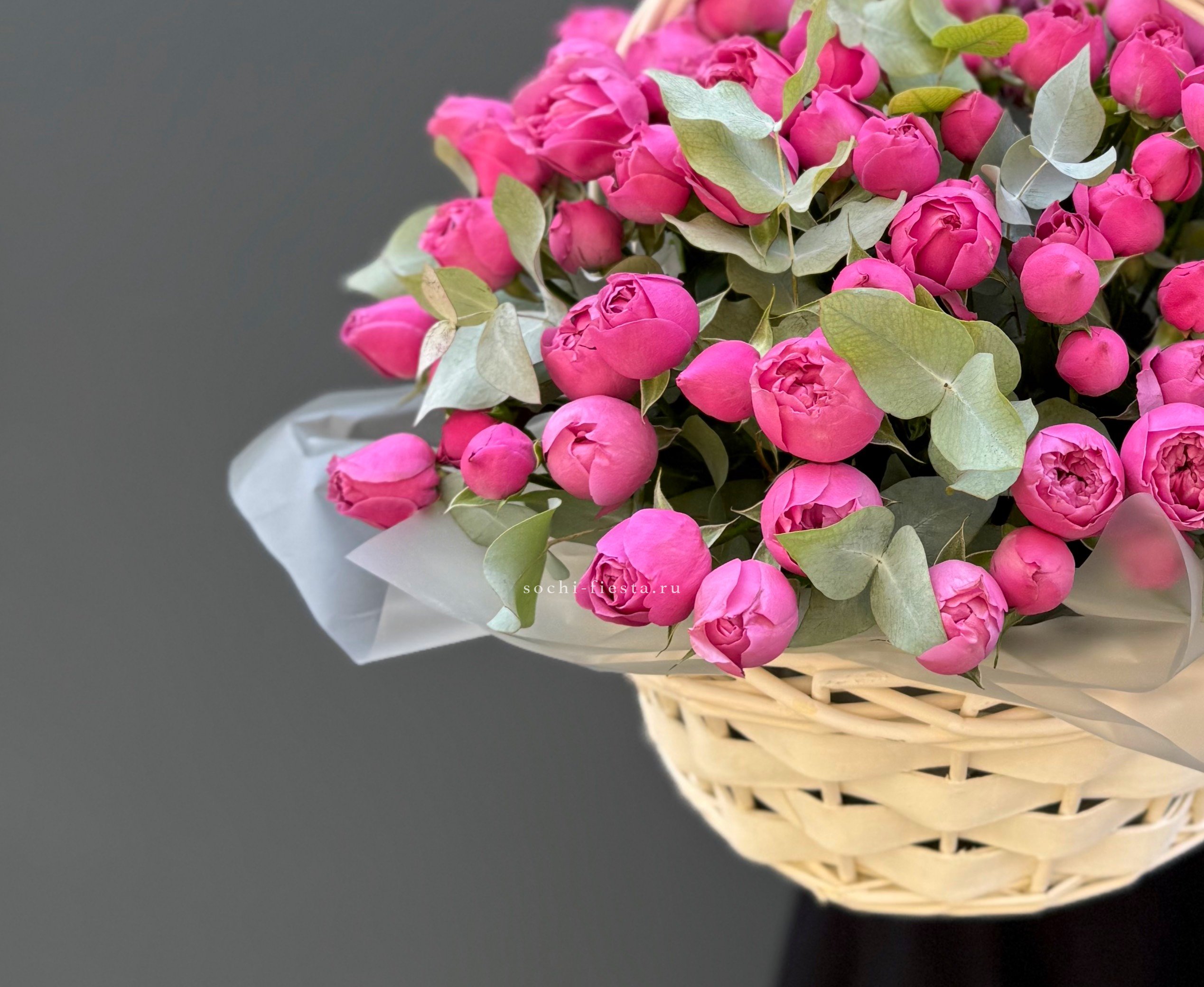 Состав: 41 пионовидная кустовая роза Misty Bubbles, эвкалипт, светлая корзина