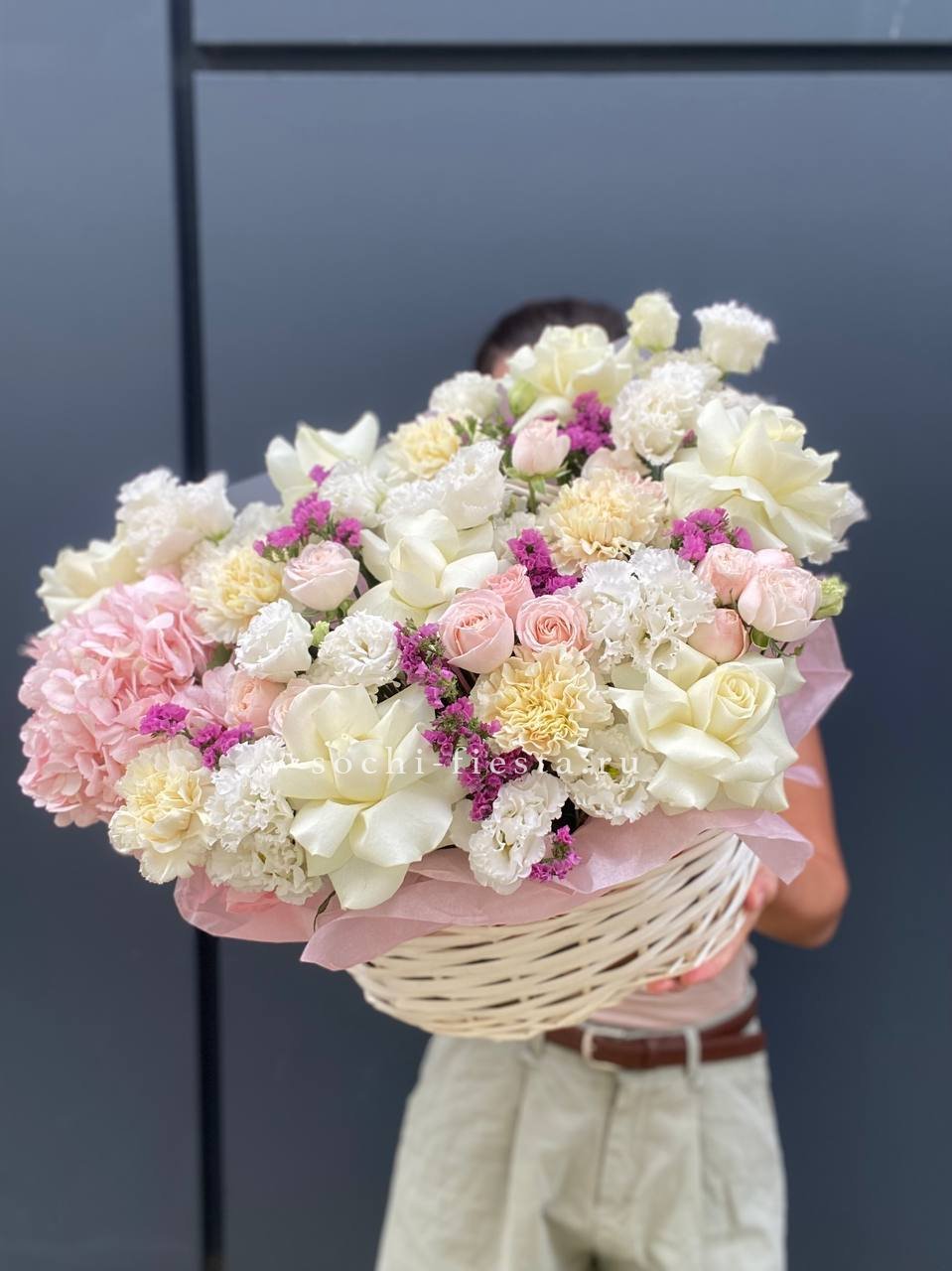 Состав: гортензия, эустома, диантус, роза, бомбастик, статица или аналог, корзина