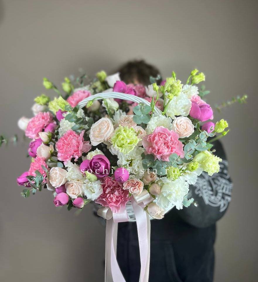 Состав: мисти баблс, бомбастик, эустома, диантус, эвкалипт, корзина маленькая