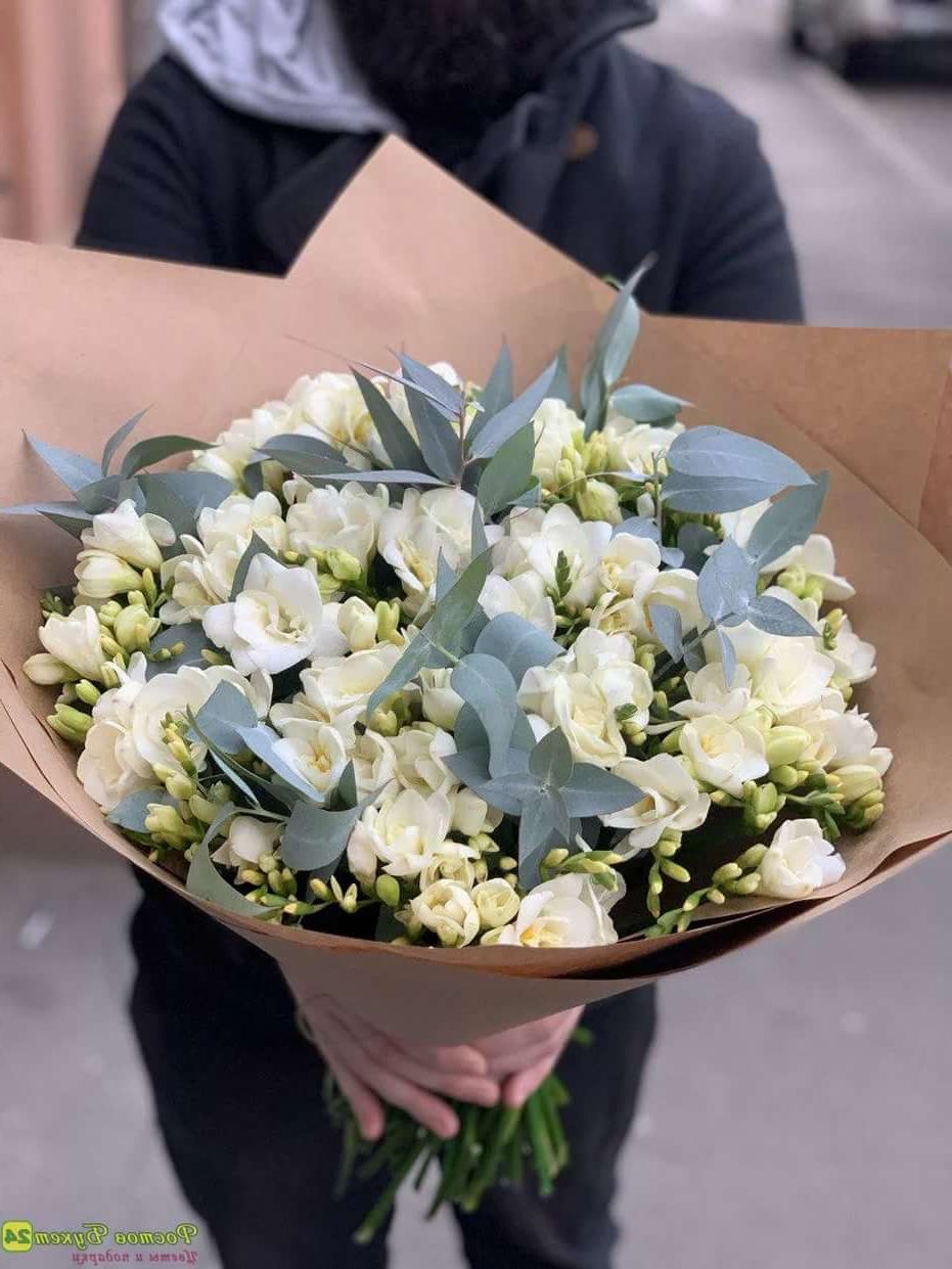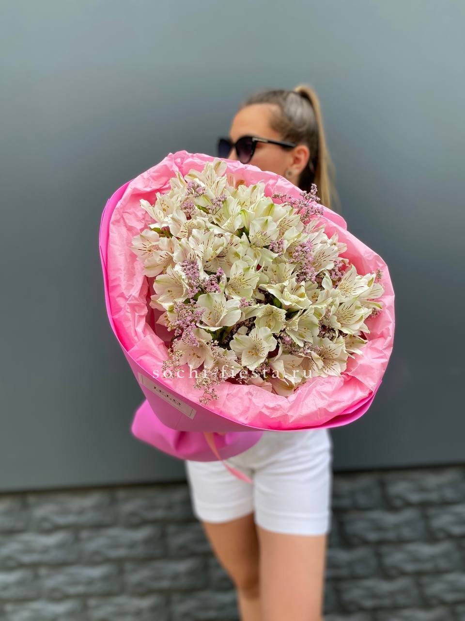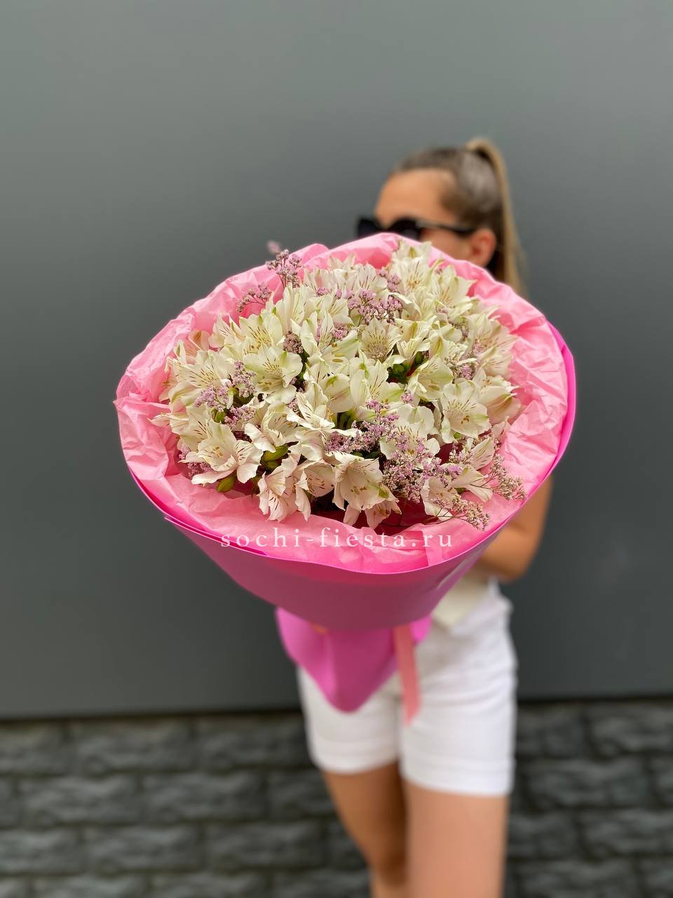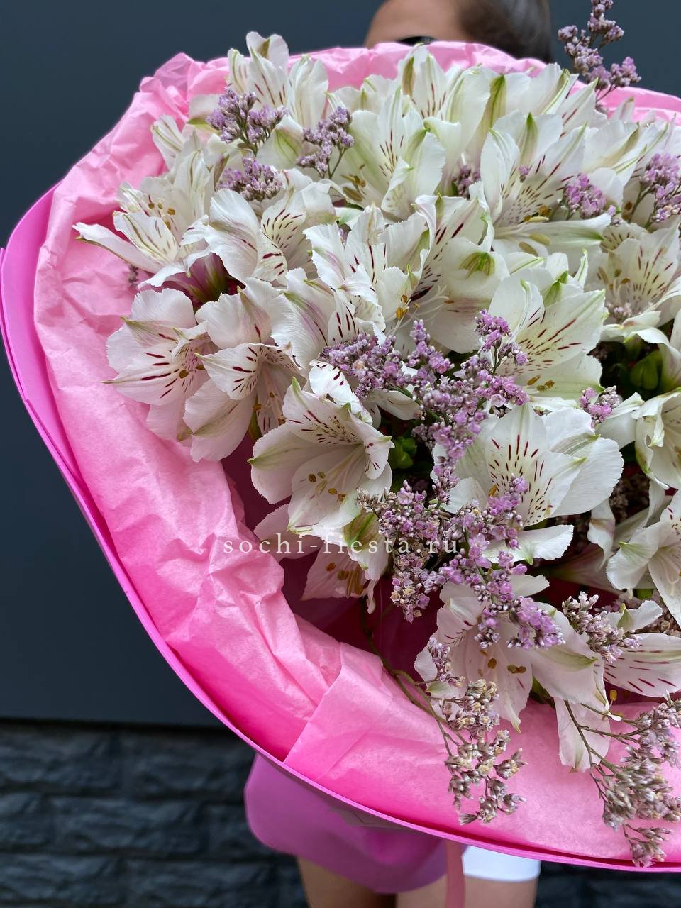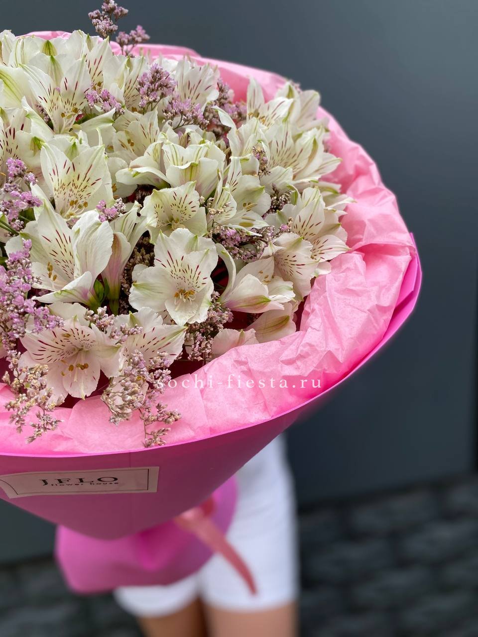 Состав: белые альстромерии - 11 шт., лимониум оформление