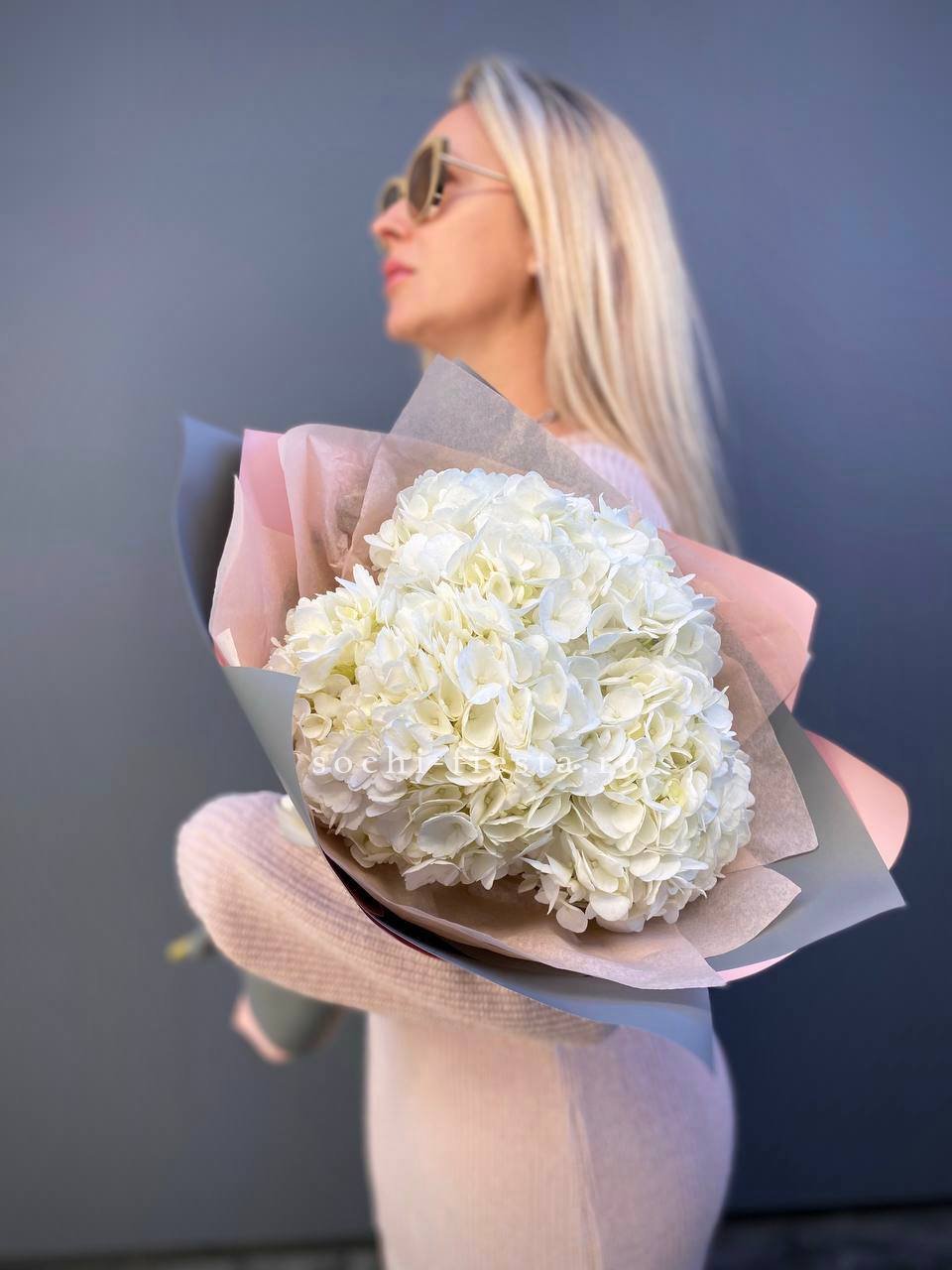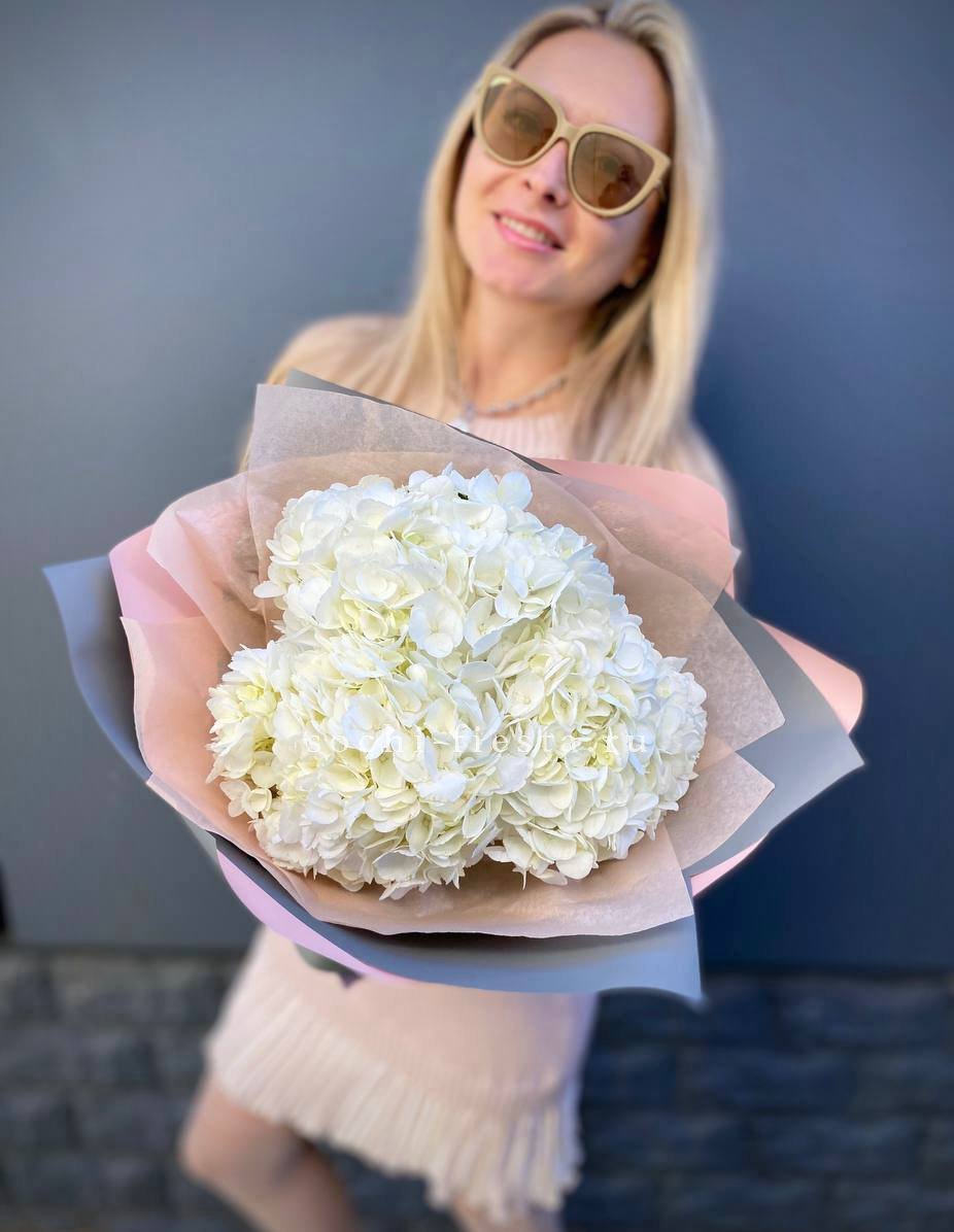 Состав: 3 белых гортензии, лента, дизайнерская пленка
