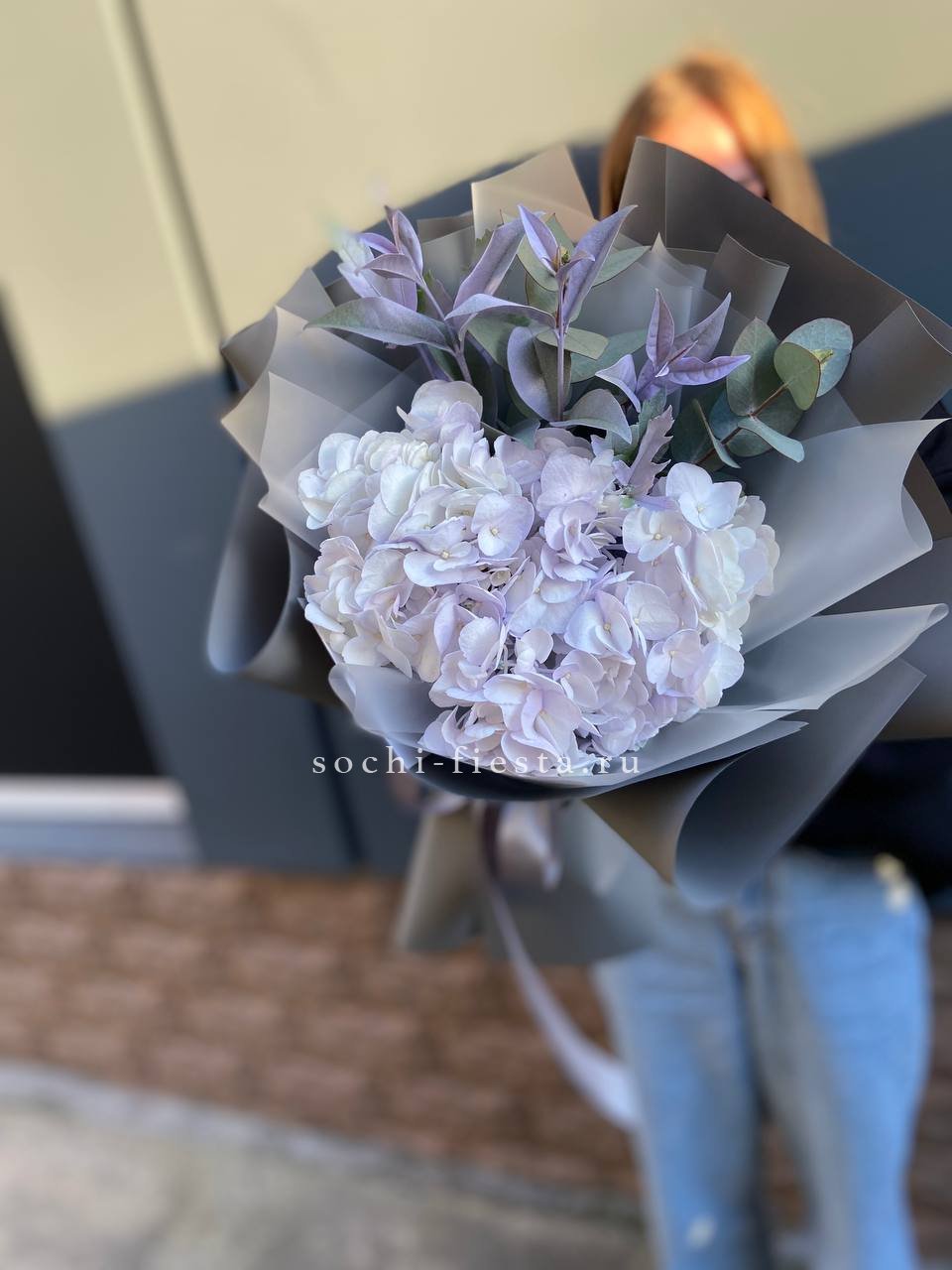 Состав: гортензия, эвкалипт, лента, дизайнерская упаковка