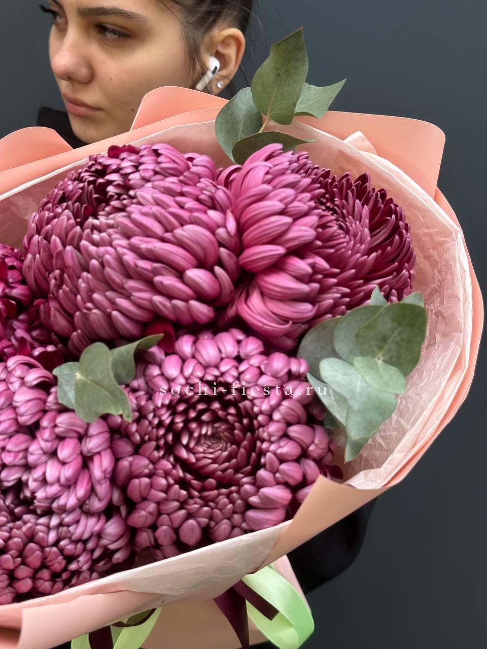 Состав букета на фотографии: хризантемы Бигуди - 5,эвкалипт,  лента, дизайнерская упаковка