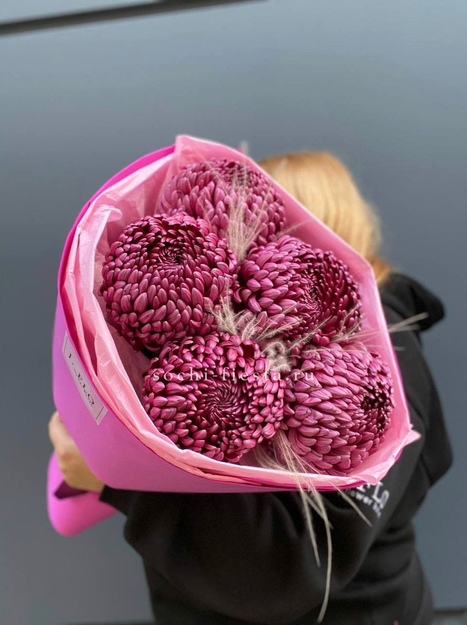 Состав букета на фотографии: хризантемы Бигуди - 5, стифа (аналог по сезону),  лента, дизайнерская упаковка