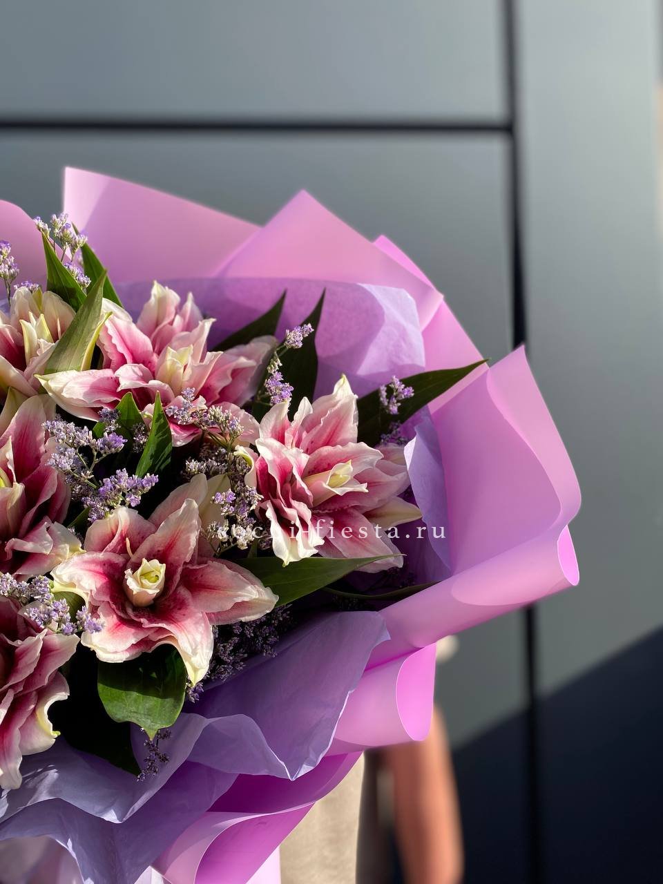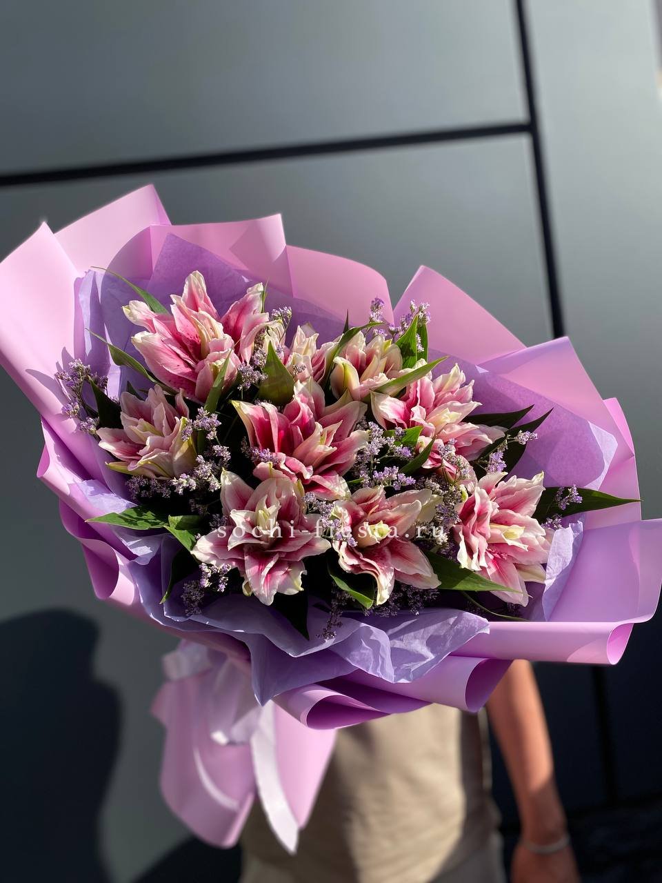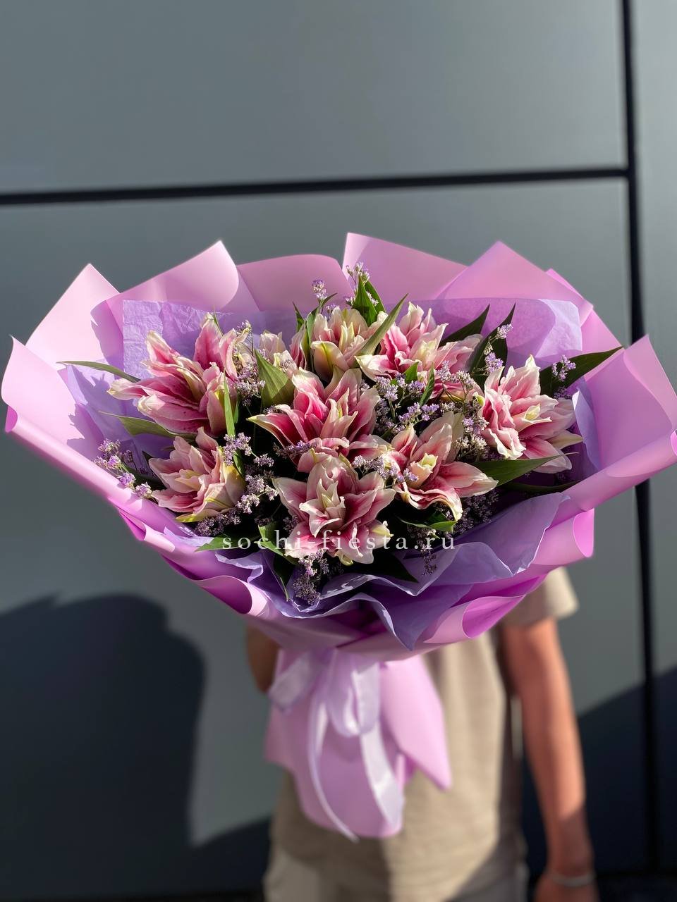 Состав: 9 пионовидных лилий, лимониум, лента, авторская упаковка
