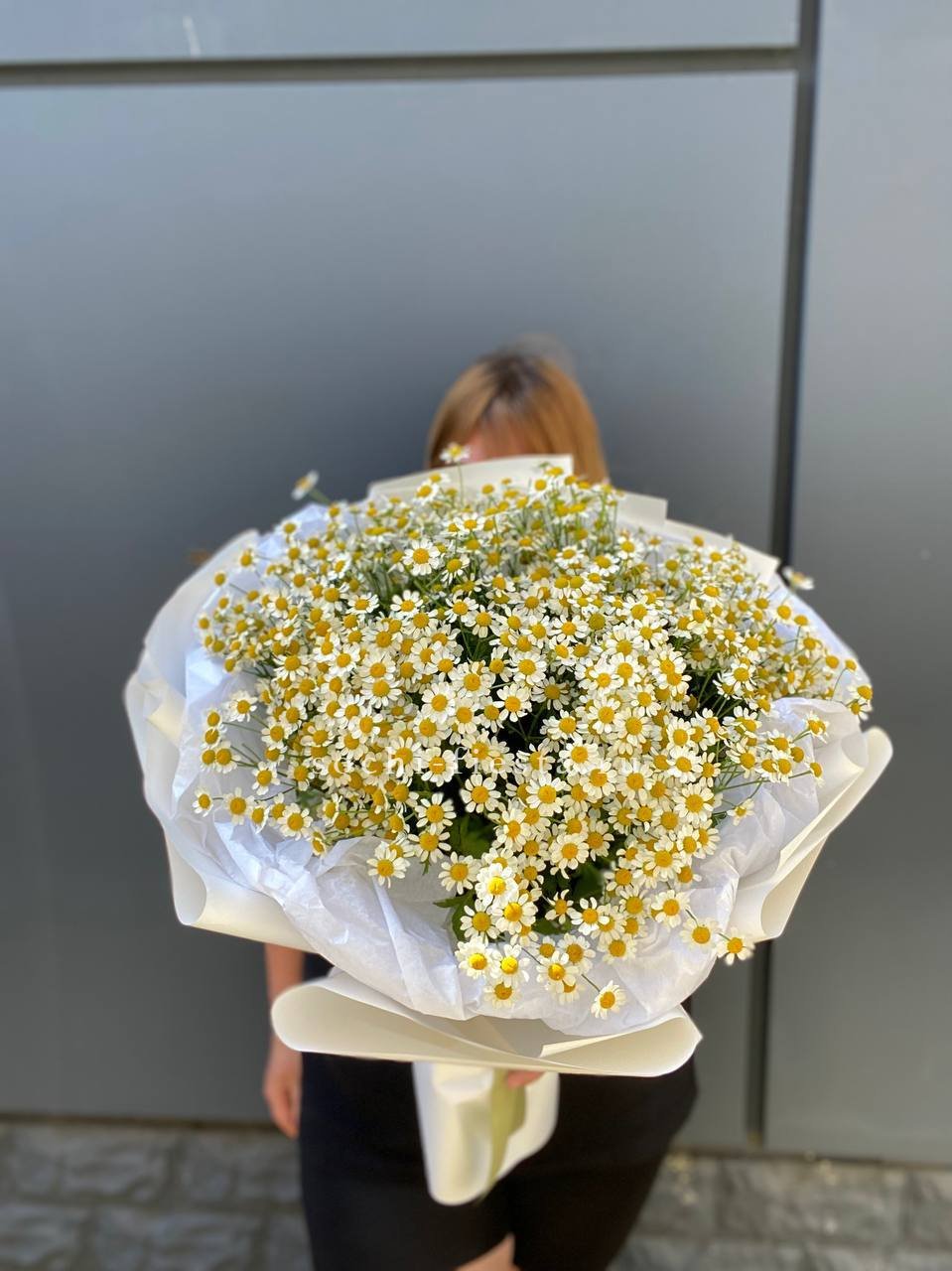 Состав букета на фотографии: ромашки (танацетум камилла) - 15 веток, лента, упаковка