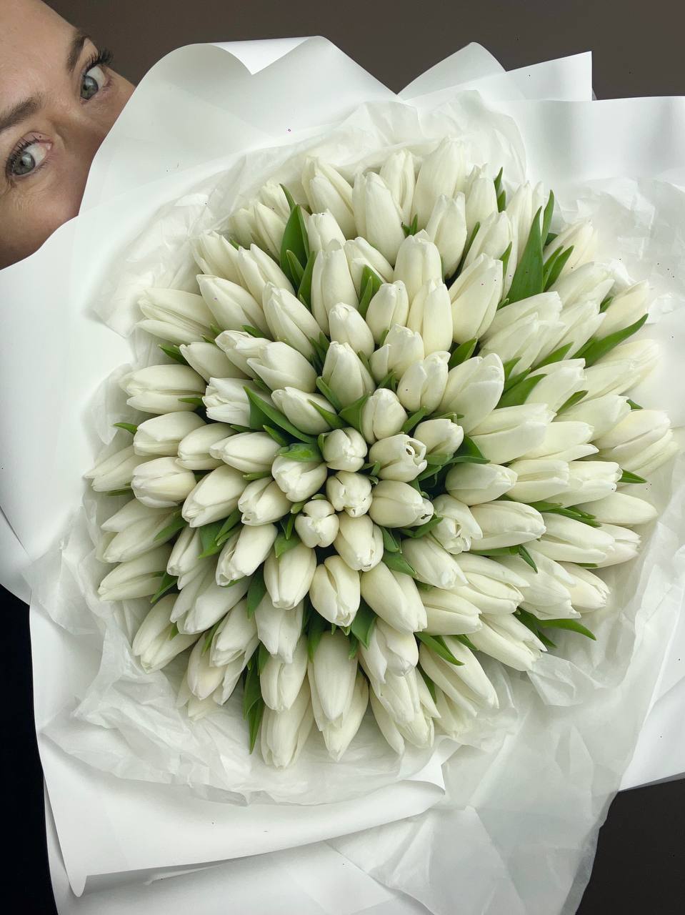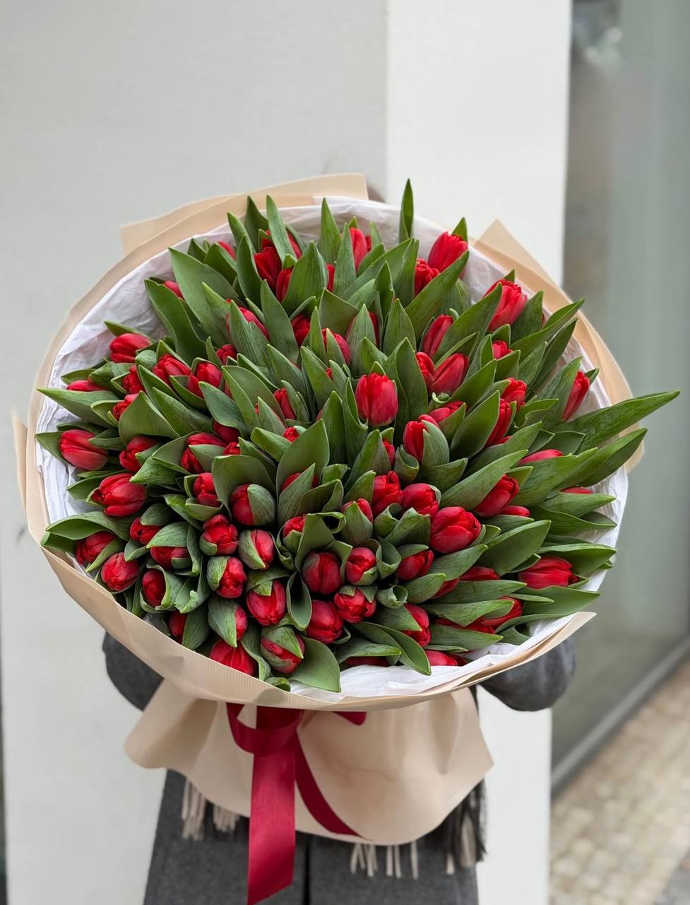 Сто один тюльпан в светлой гамме создаёт впечатляющий объём и выразительное присутствие. Плотная сборка бутонов образует графичную форму с чётким силуэтом.