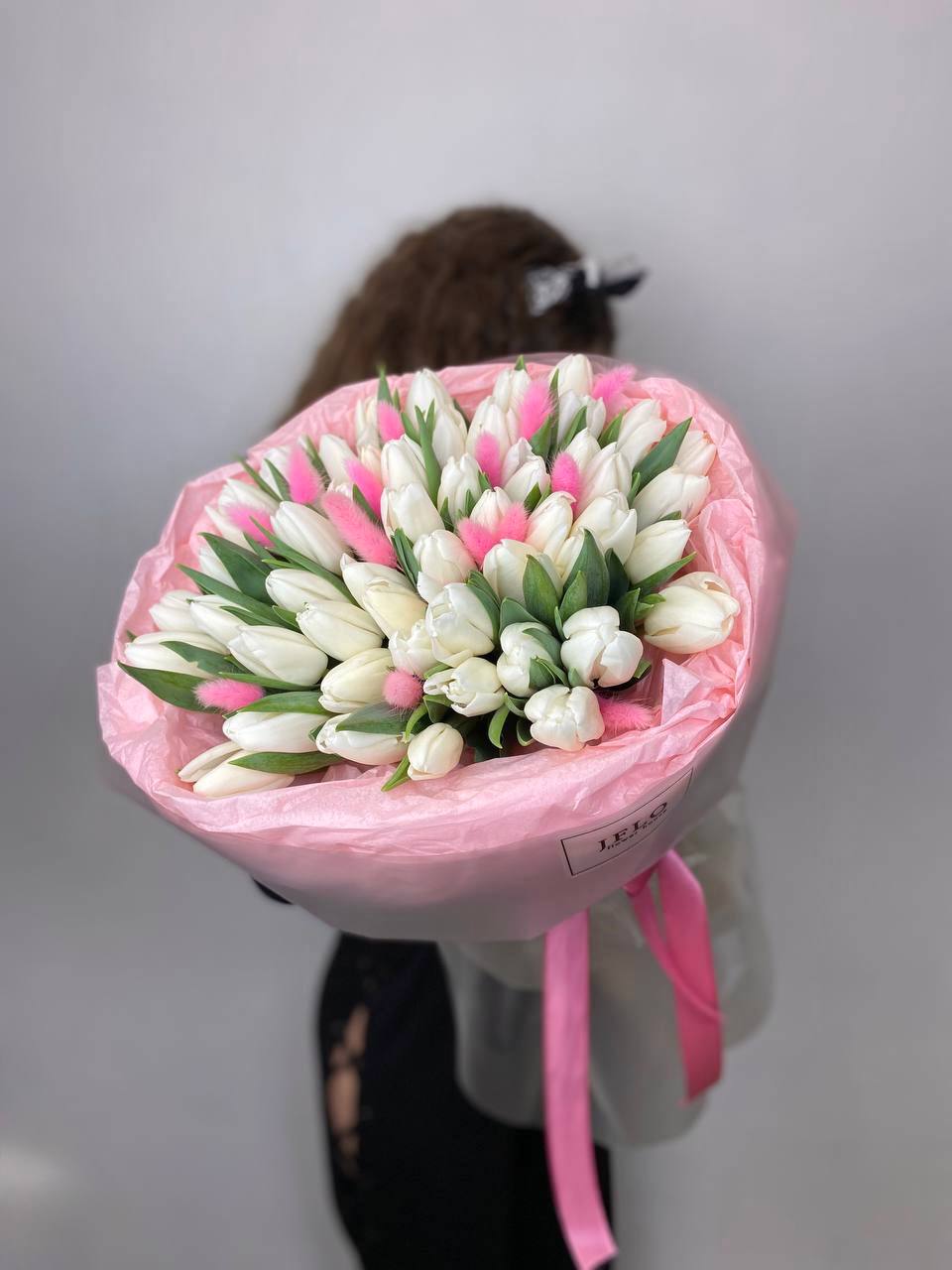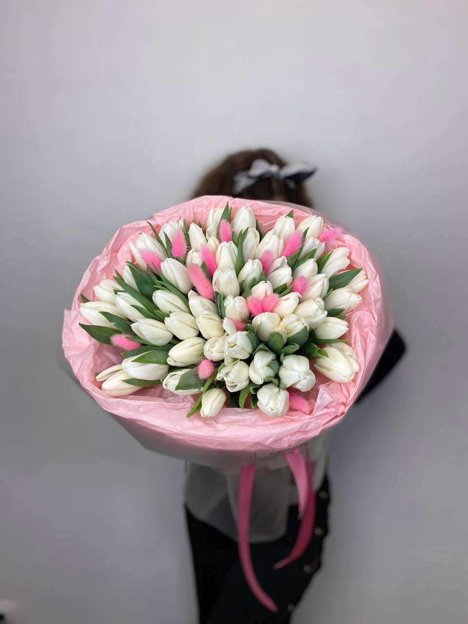 Пятьдесят один белоснежный тюльпан собран в плотный монохромный букет с мягкими соцветиями лагуруса. Чистая графика весенних бутонов создает ощущение свежести и простора.