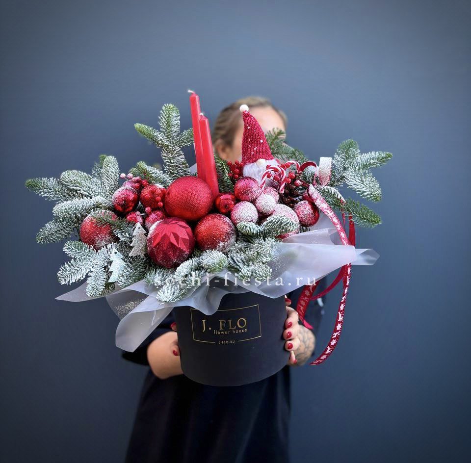 Состав: нобилис, цилиндр, оазис, свечи, новогодние игрушки, декор