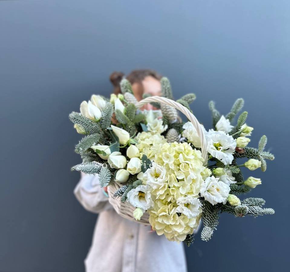 Состав: гортензия, белая роза, эустома, нобилис, новогоднее оформление.