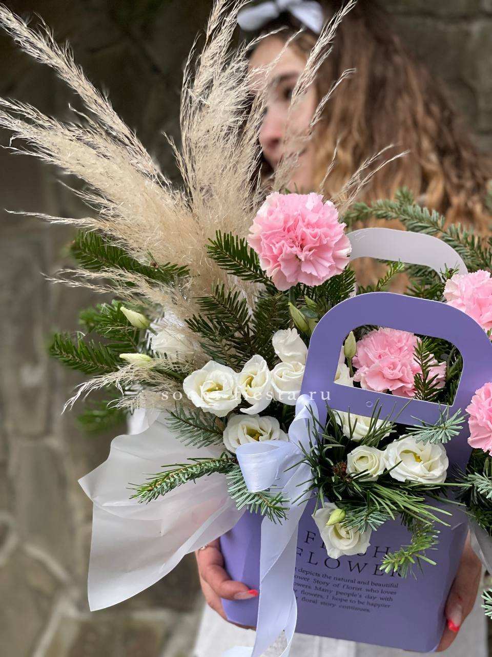 Состав: датский нобилис 3шт, диантусы, эустомы, пампасная трава, сумка, лента, оазис