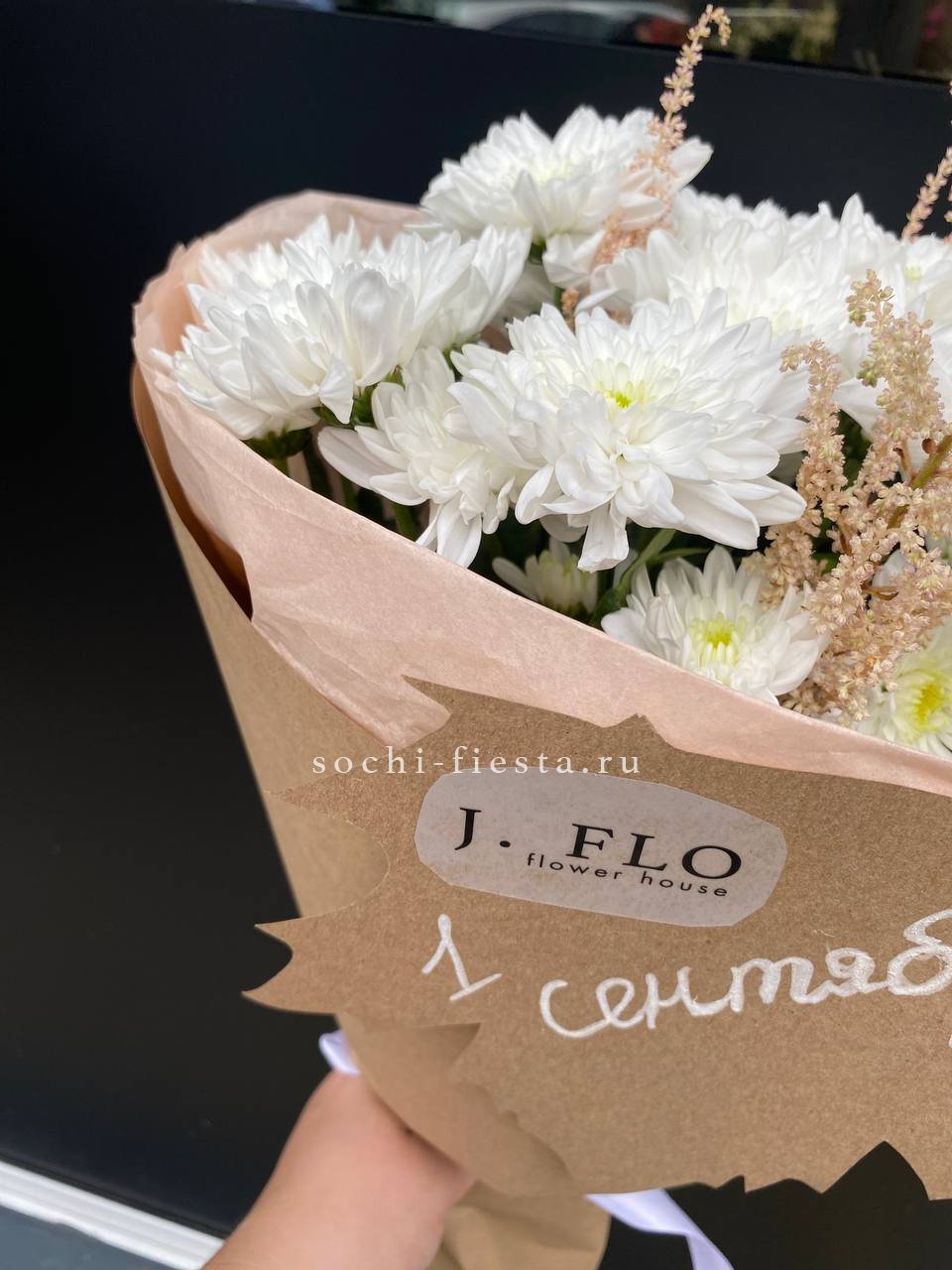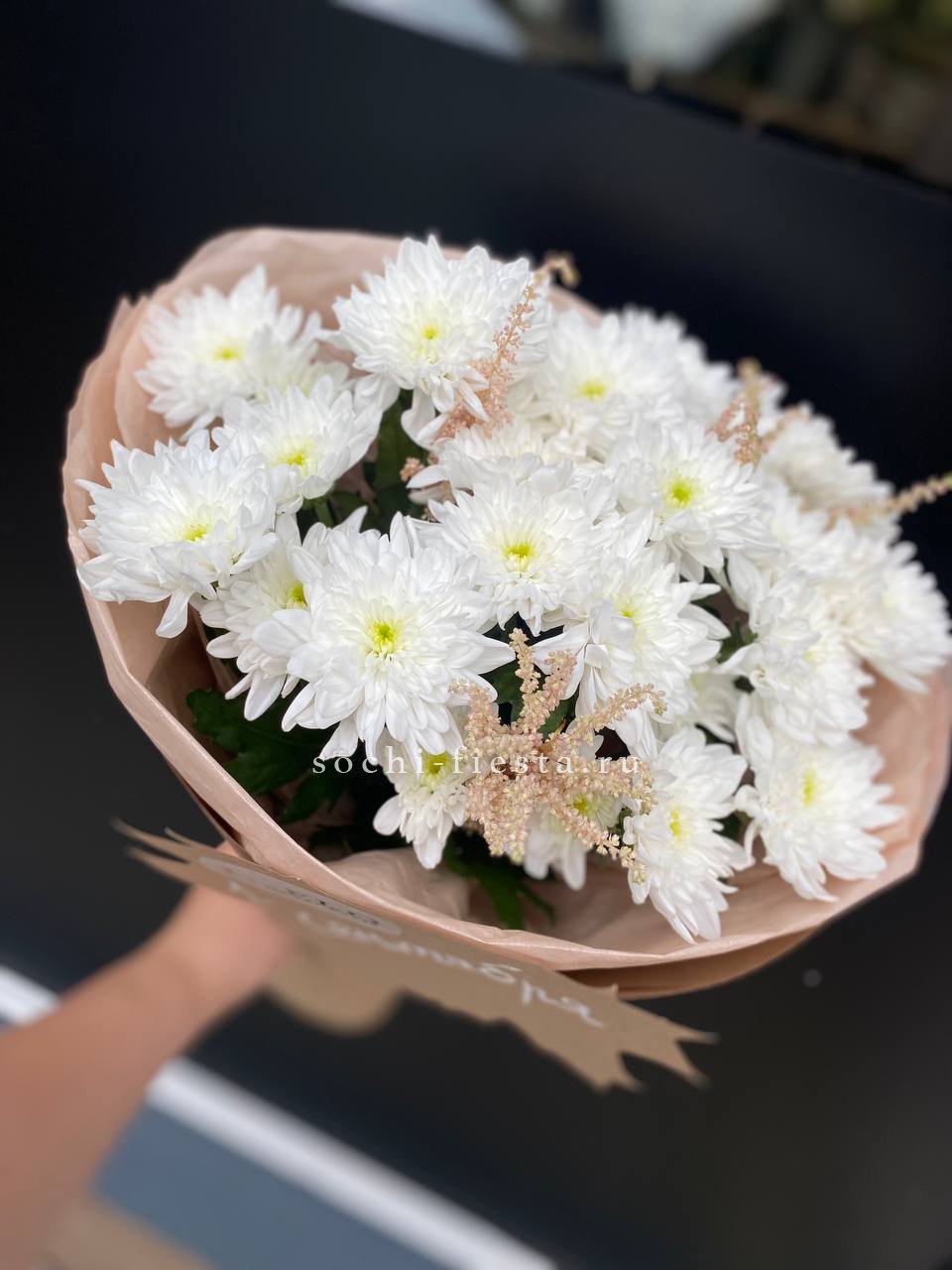Состав: хризантемы 5 шт., астильба 2 шт., авторское оформление