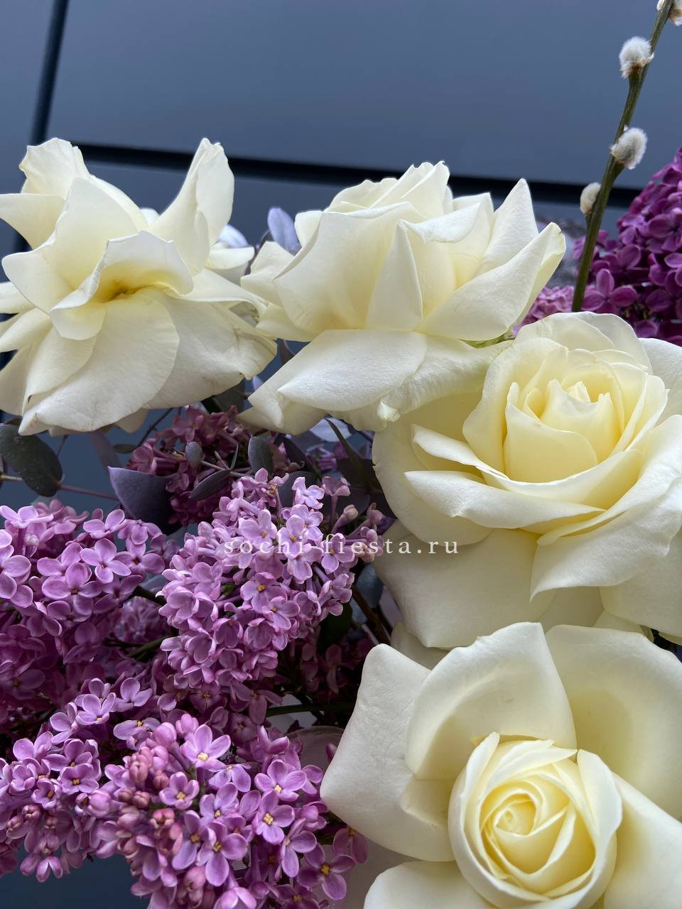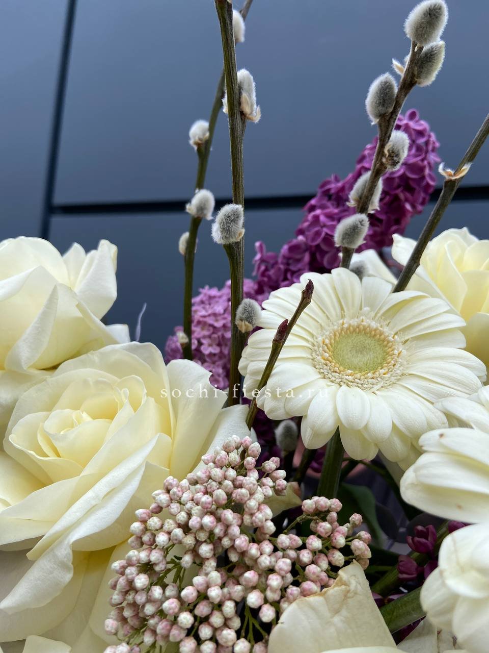 Состав выполнен из белых роз, вербы, сирени, гербер