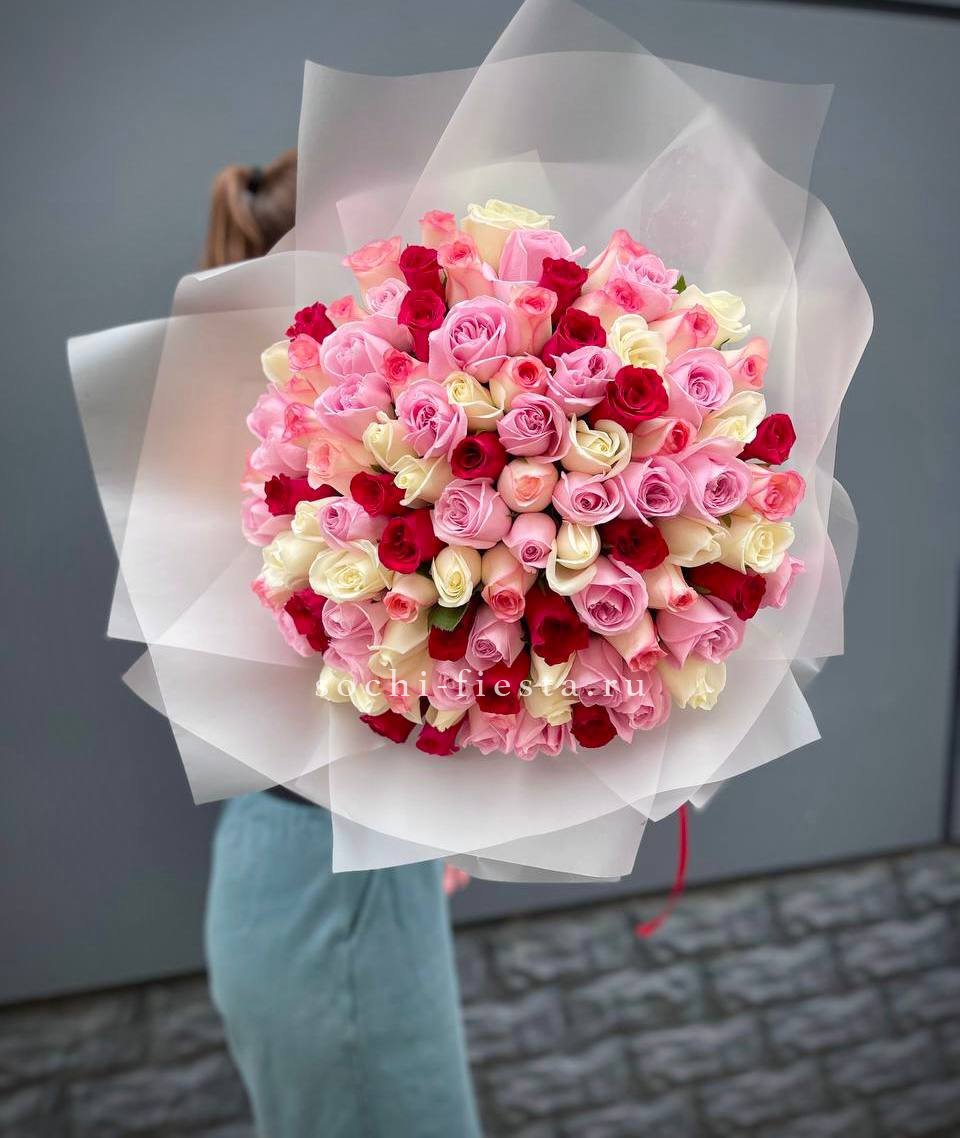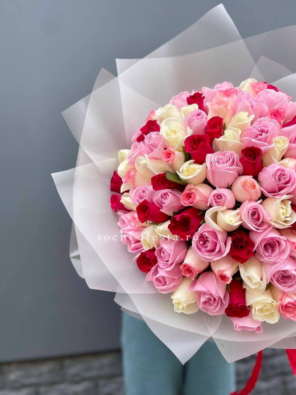 Состав: 101 роза разноцветных оттенков, лента, упаковка на выбор