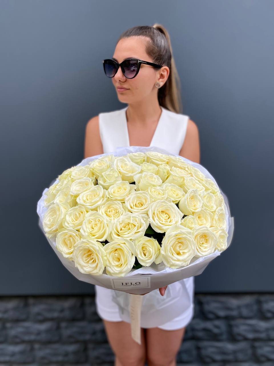 Состав букета на фотографии: 51 белая роза, лента, дизайнерская бумага