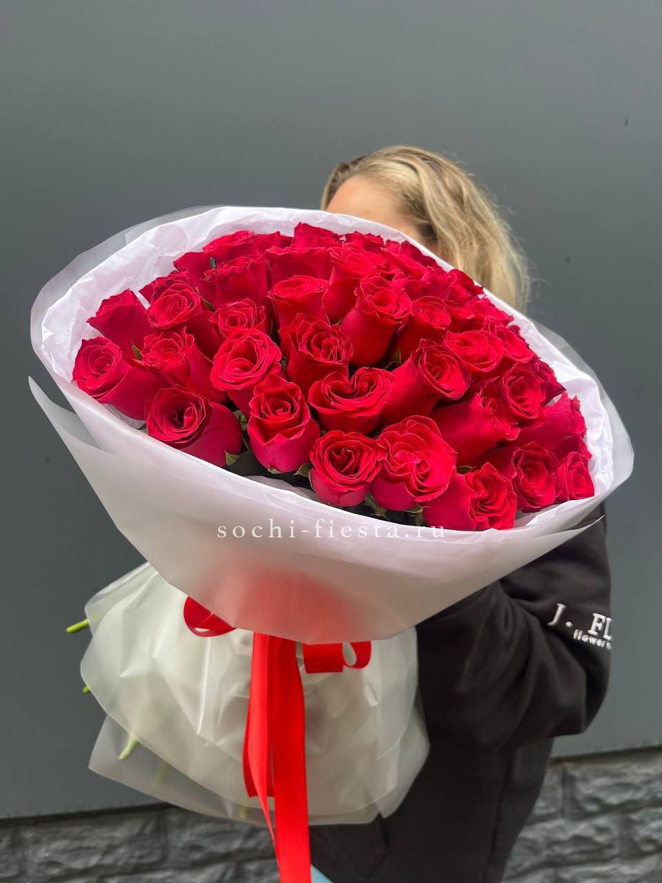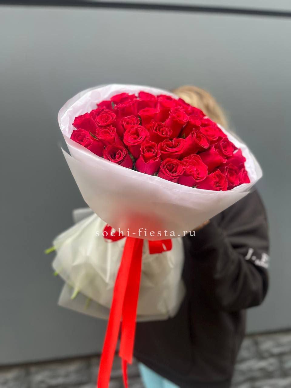 Состав букета на фотографии: 55 красных роз, лента, упаковка
