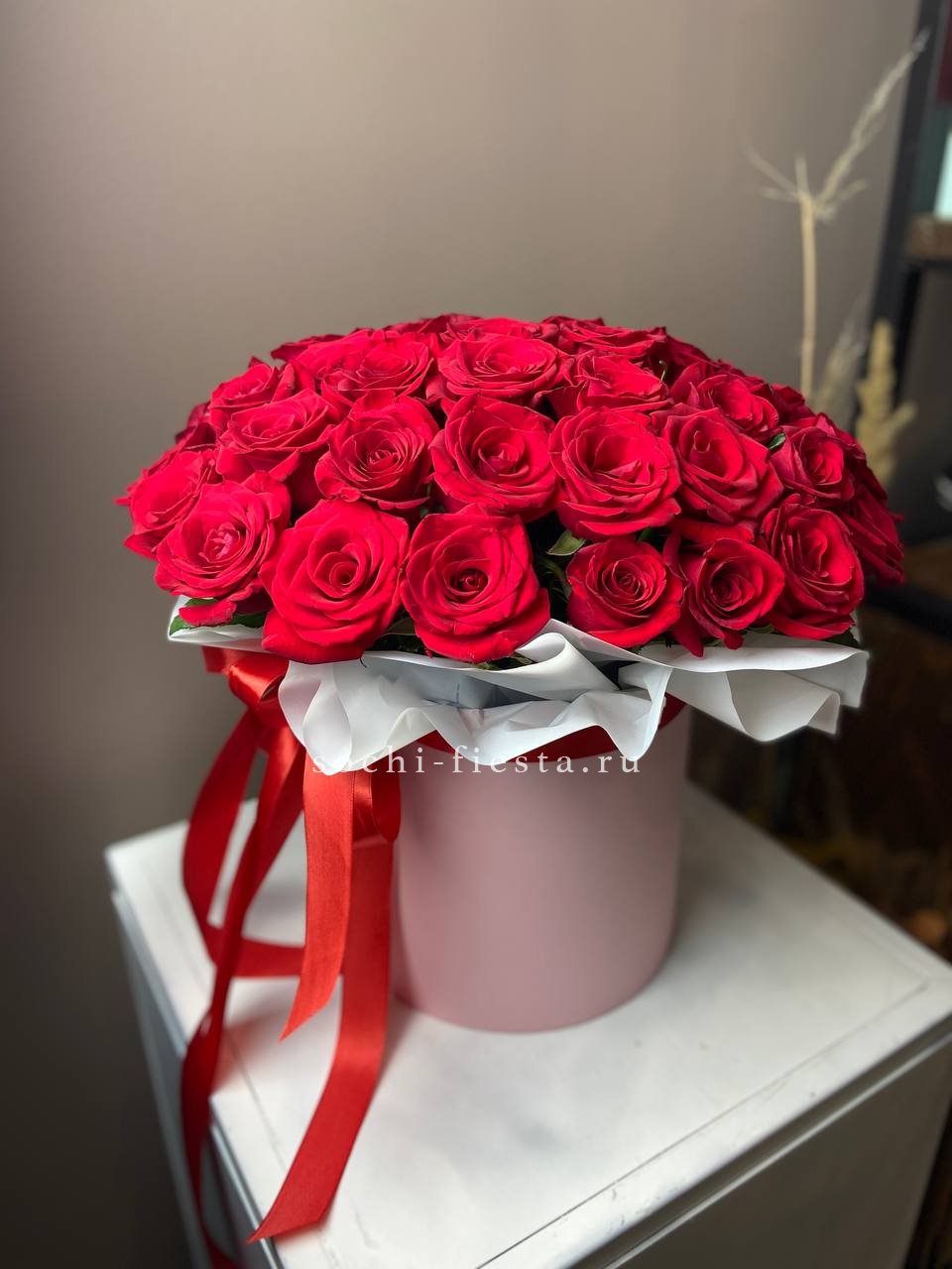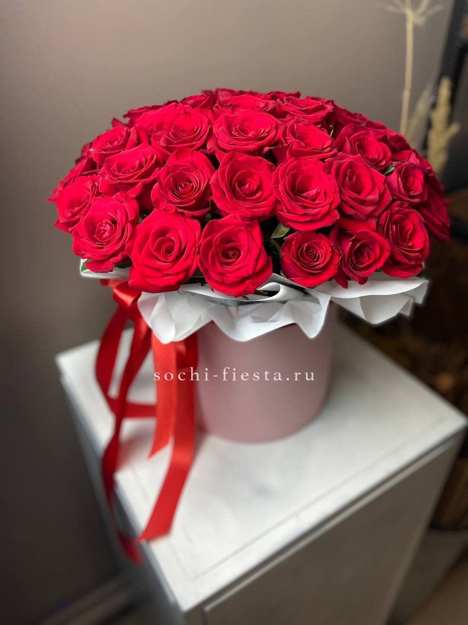 Пышные махровые бутоны с густыми лепестками собраны в монохромную композицию под атласную ленту. Классическая форма для важных моментов и душевных признаний.