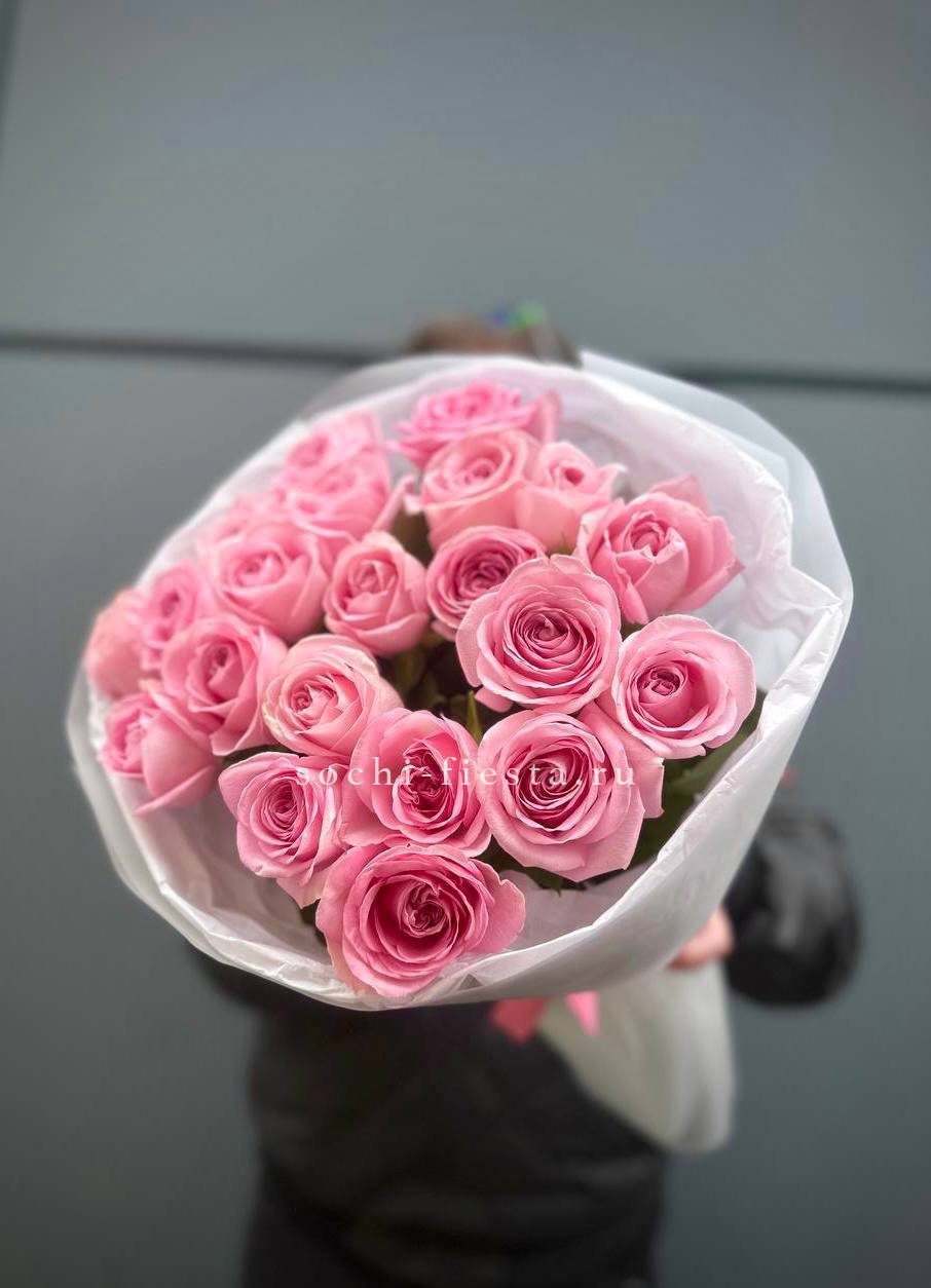 Состав: 9 розовых роз, лента, крафт