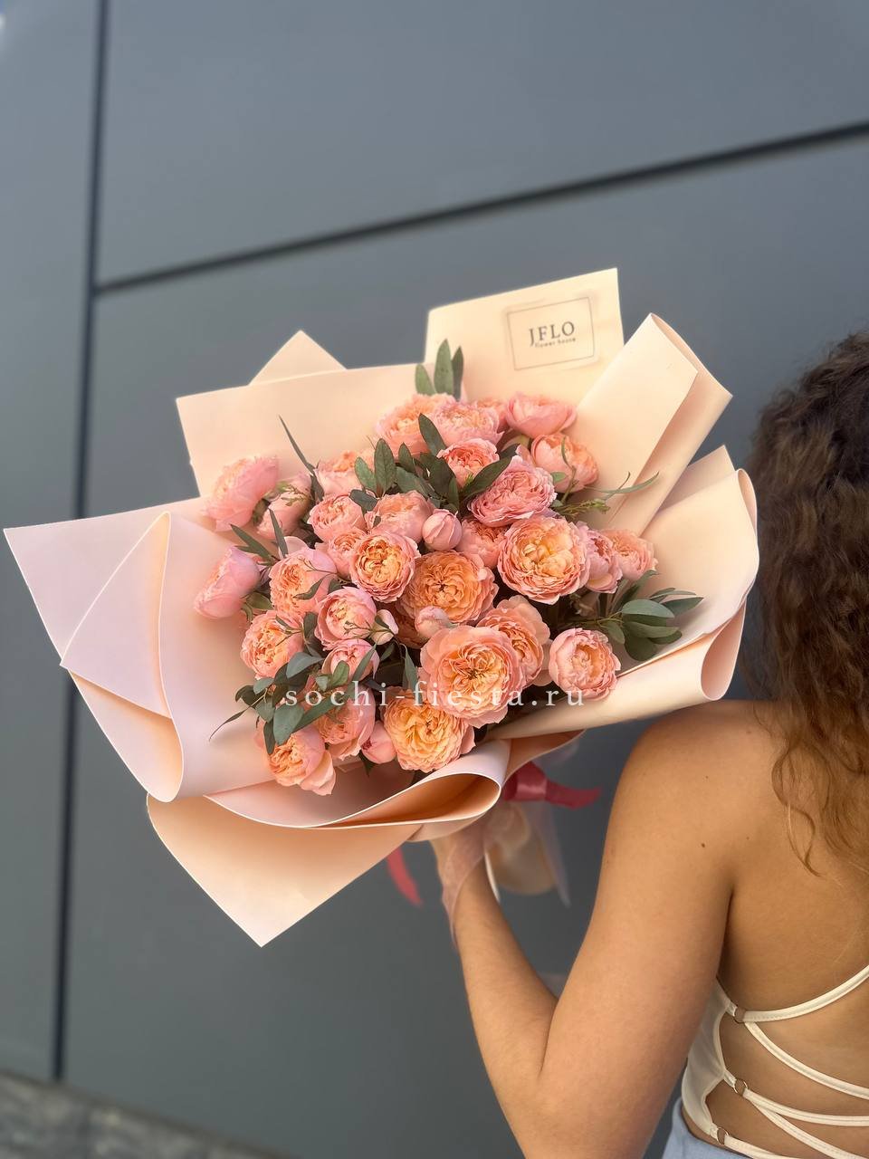 Яркий букет из 11 пионовидных кустовых роз с эвкалиптом.