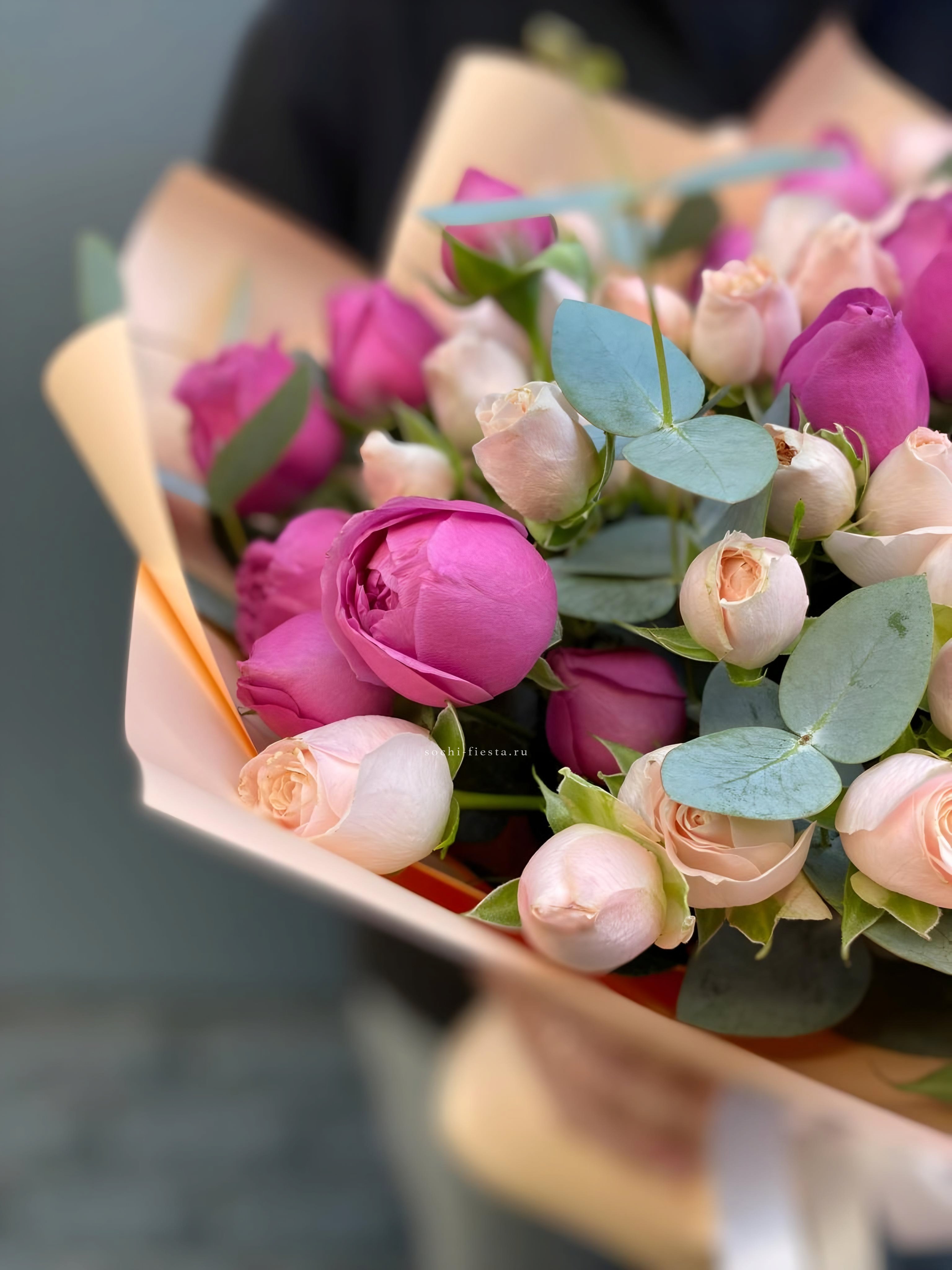 Состав: 9 пионовидных кустовых роз, 12 кустовых роз, лента, дизайнерская упаковка