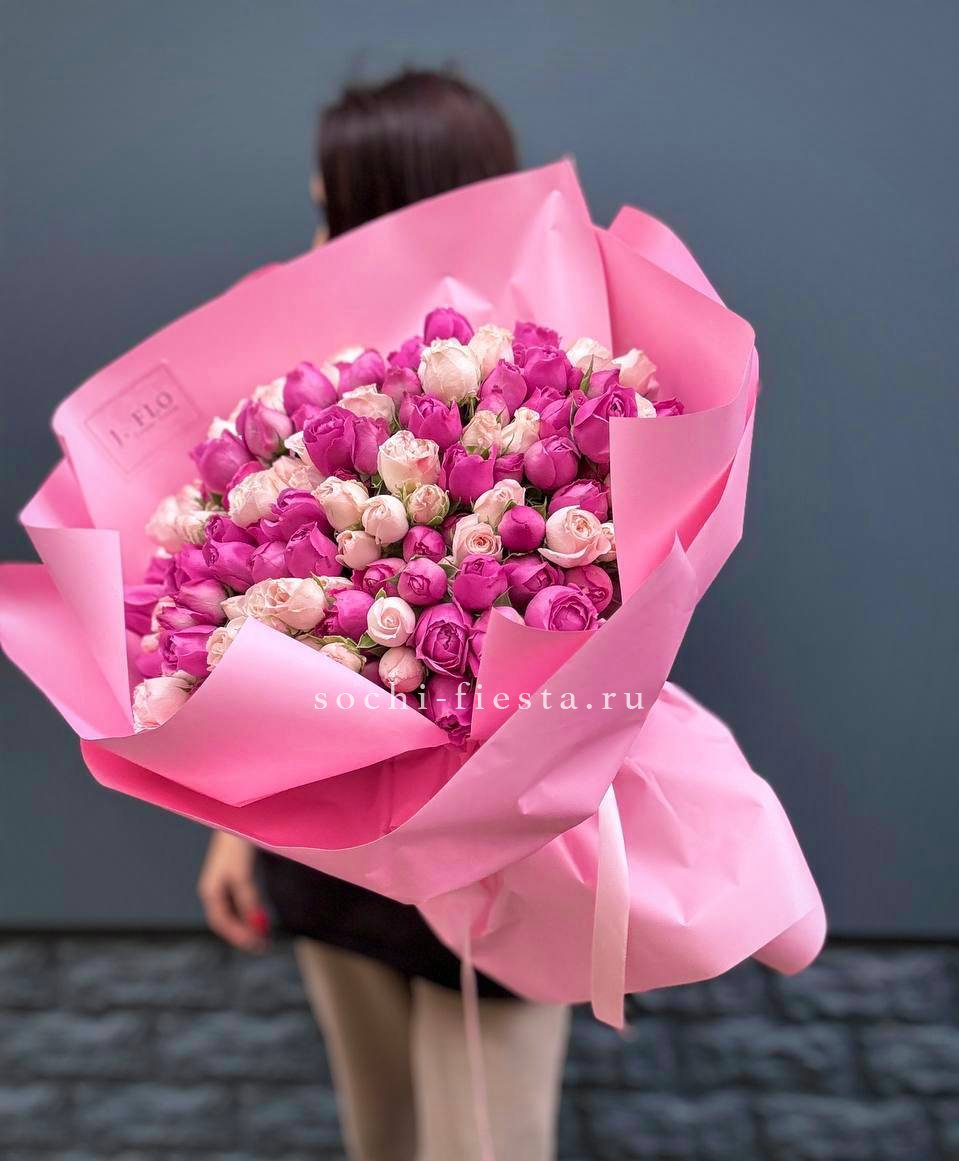 Этот букет создан, чтобы поражать и восхищать! Невероятный объем и каскад роз от нежно-розовых до насыщенных малиновых оттенков создают ощущение настоящего водопада цветов. Это не просто подарок, а целый мир ярких эмоций, упакованный в стильную розовую бумагу. Грандиозный и запоминающийся жест, который скажет о ваших чувствах красноречивее тысячи слов.