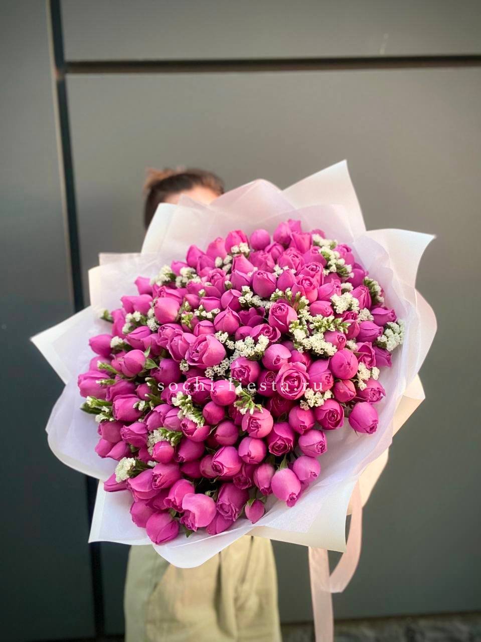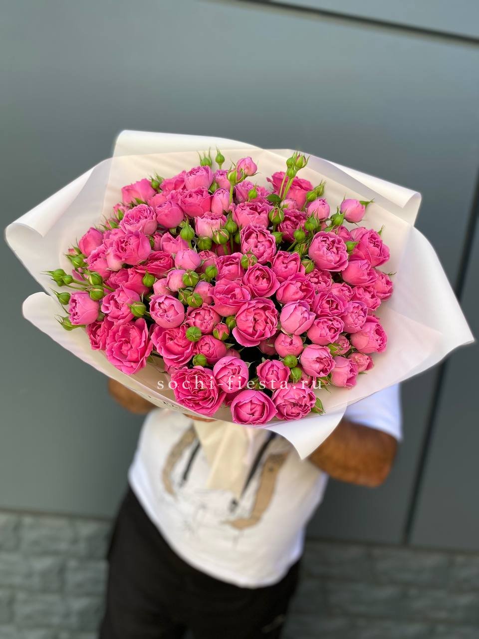 Состав: 51 пионовидная кустовая кустовая роза Мисти Баблс, статица, лента, дизайнерская упаковка