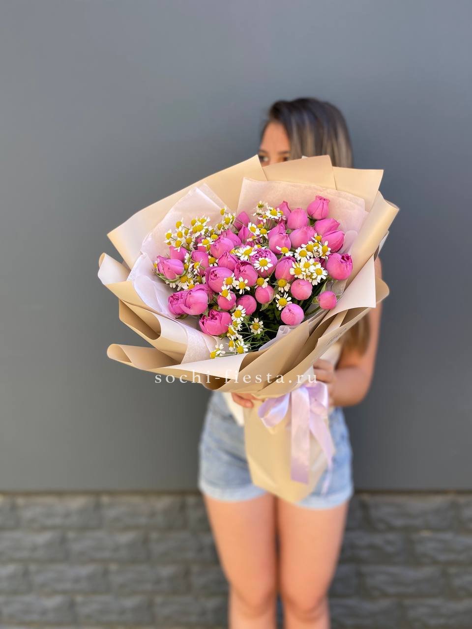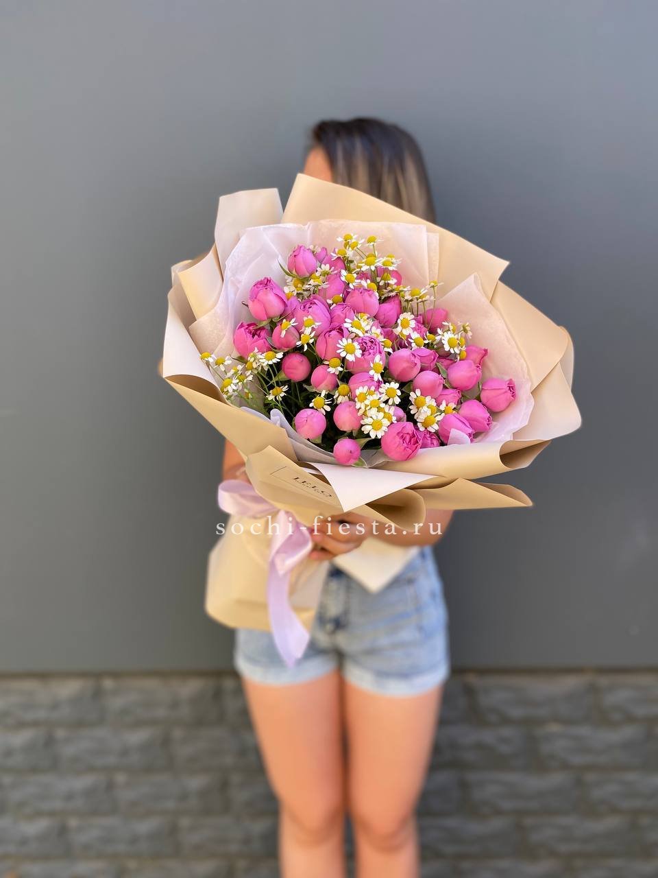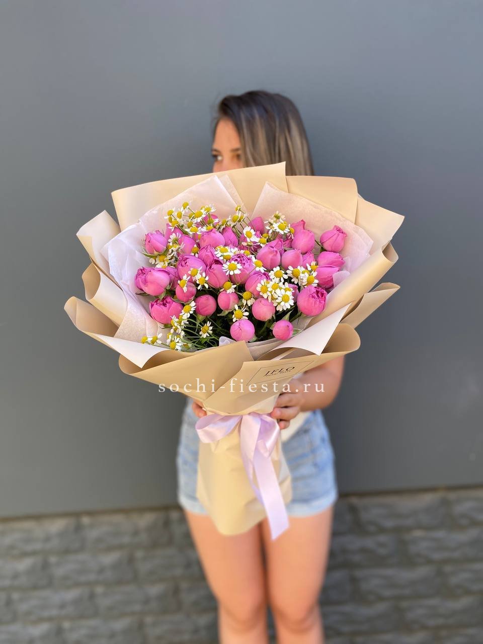 Состав: кустовые розы мисти бабблс, ромашки, лента, упаковка