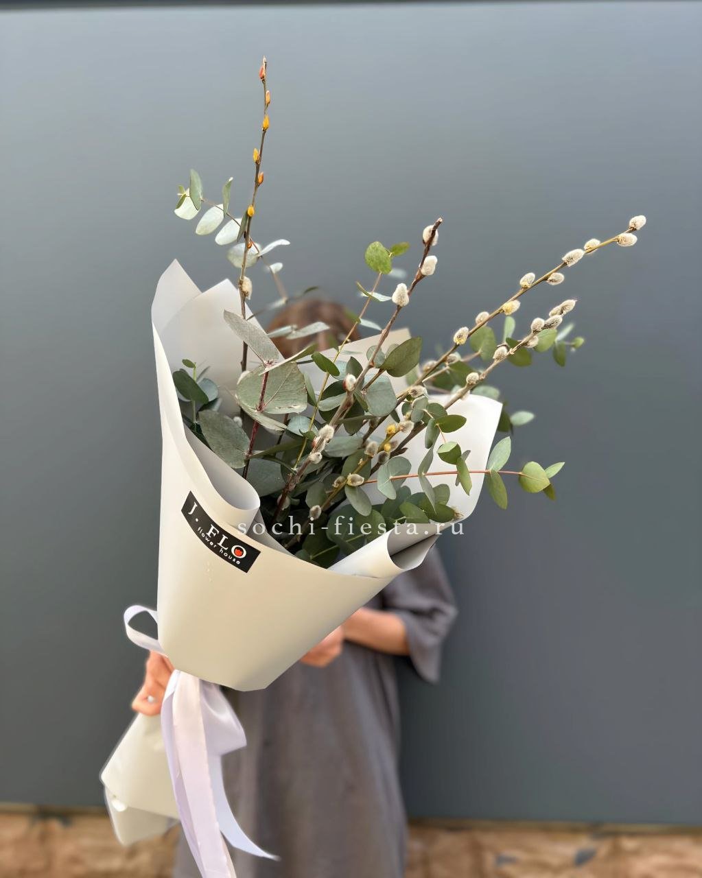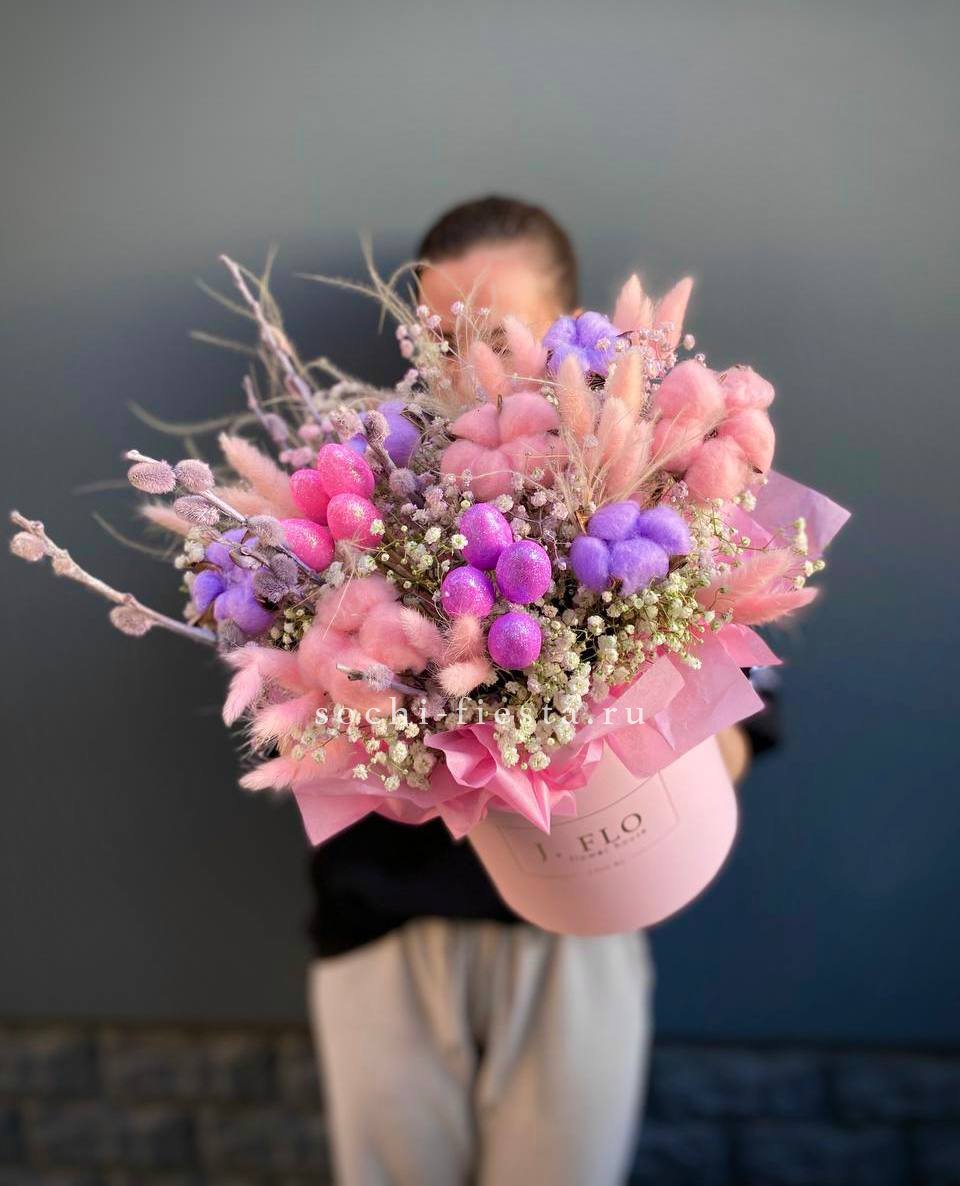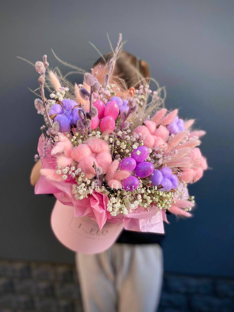 Состав: гипсофила, хлопок, верба, ковыль, яйца, лагурус,  тишью, цилиндр D16