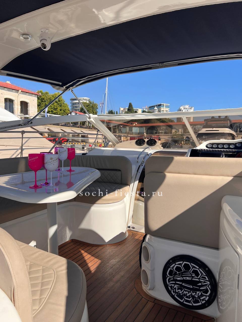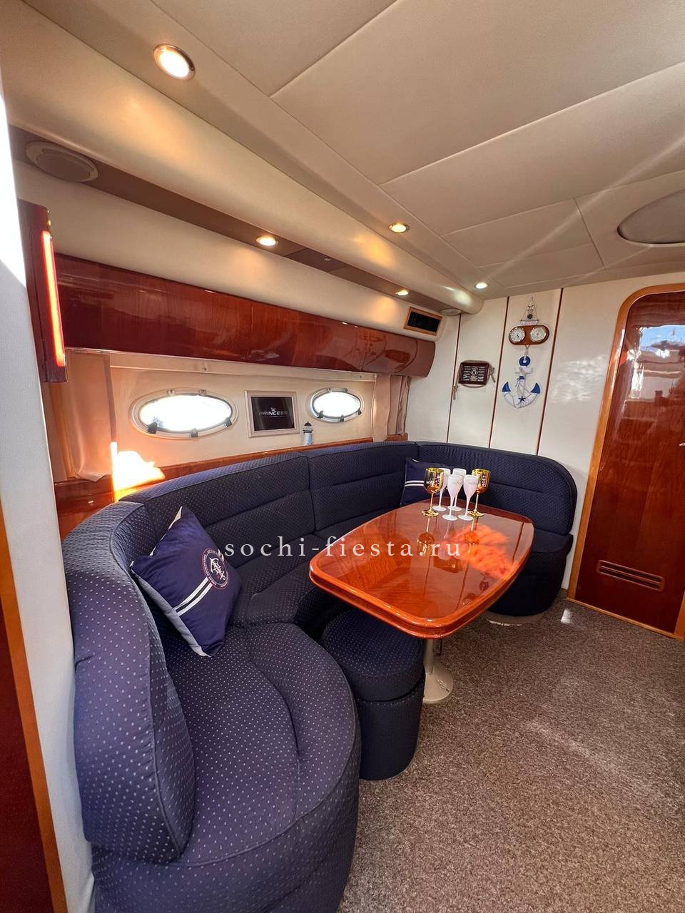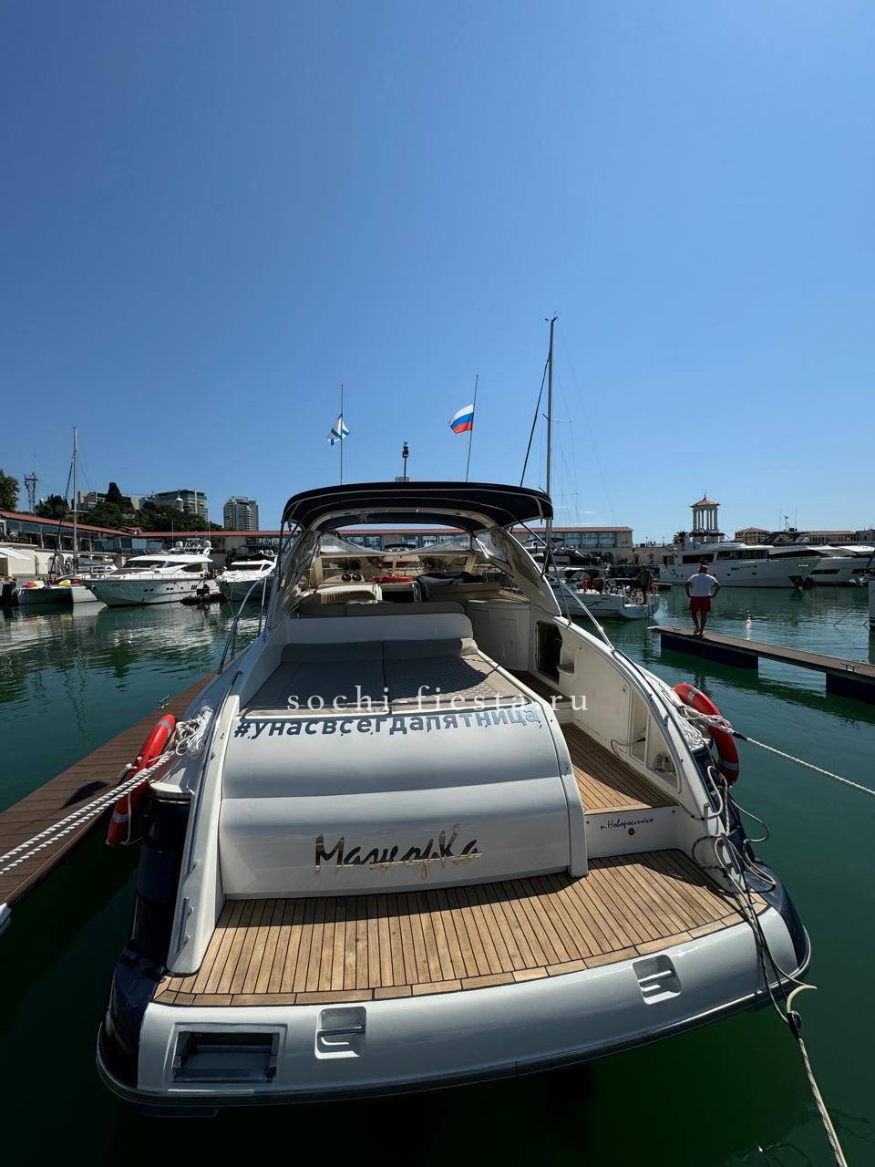 Оборудование: гостевая зона за столом на диванах + задняя зона для загара , закрыто тентом от солнца и окнами от ветра , палуба и купальная платформа покрыта тиком , раковина и кормовой душ х/г вода (пресная), на носу большая подушка для загара , две каюты (4-6чел) , туалет с душем , кухня с приборами, холодильник 2 шт, музыка премиум-класса ( AUX, bluetooth ) 2 киловатта звука, развлечения : сап-сёрф ,плюшка , жилеты , удочки , гидроциклы , вейк и т.д. по вашему желанию.