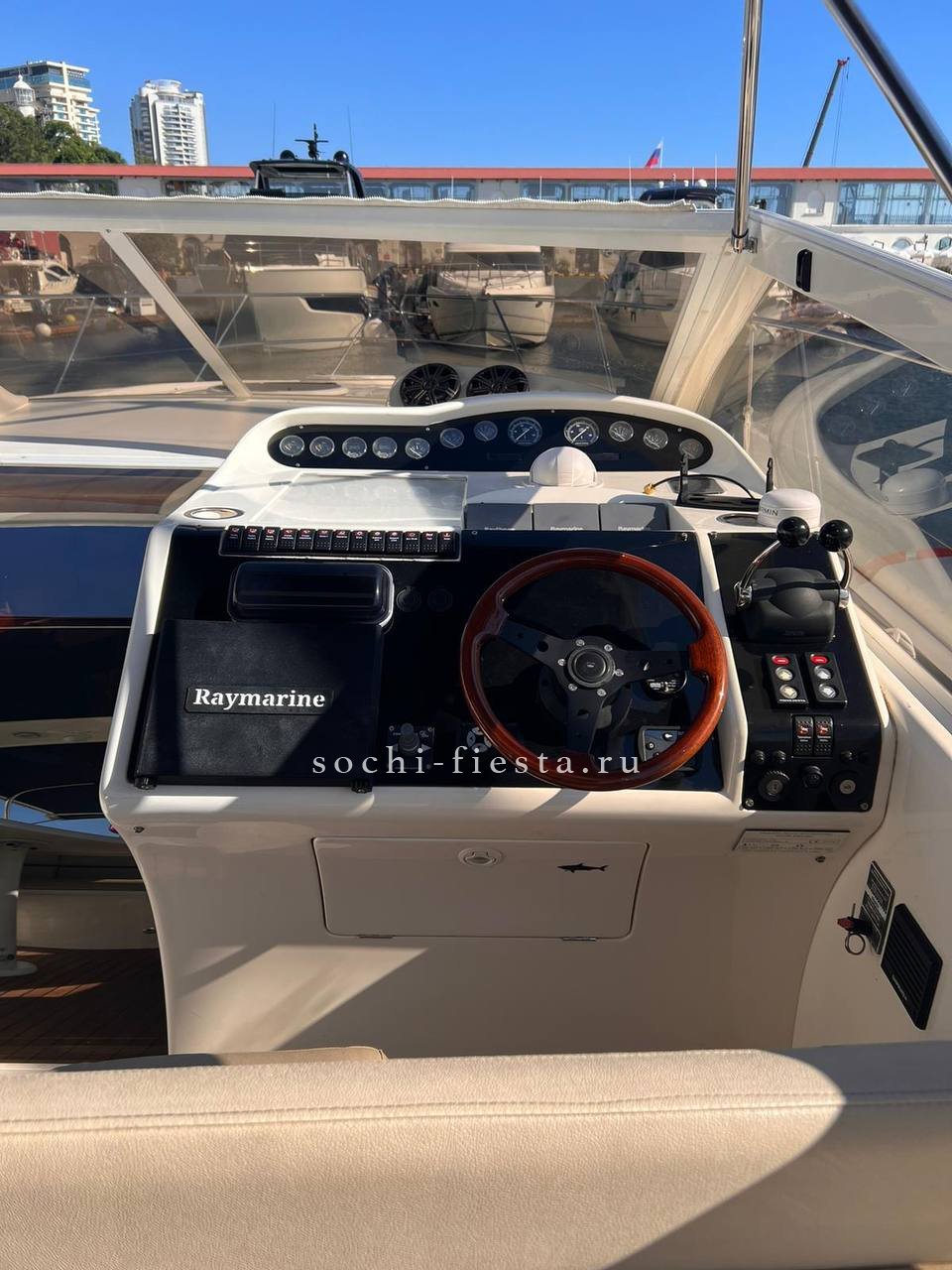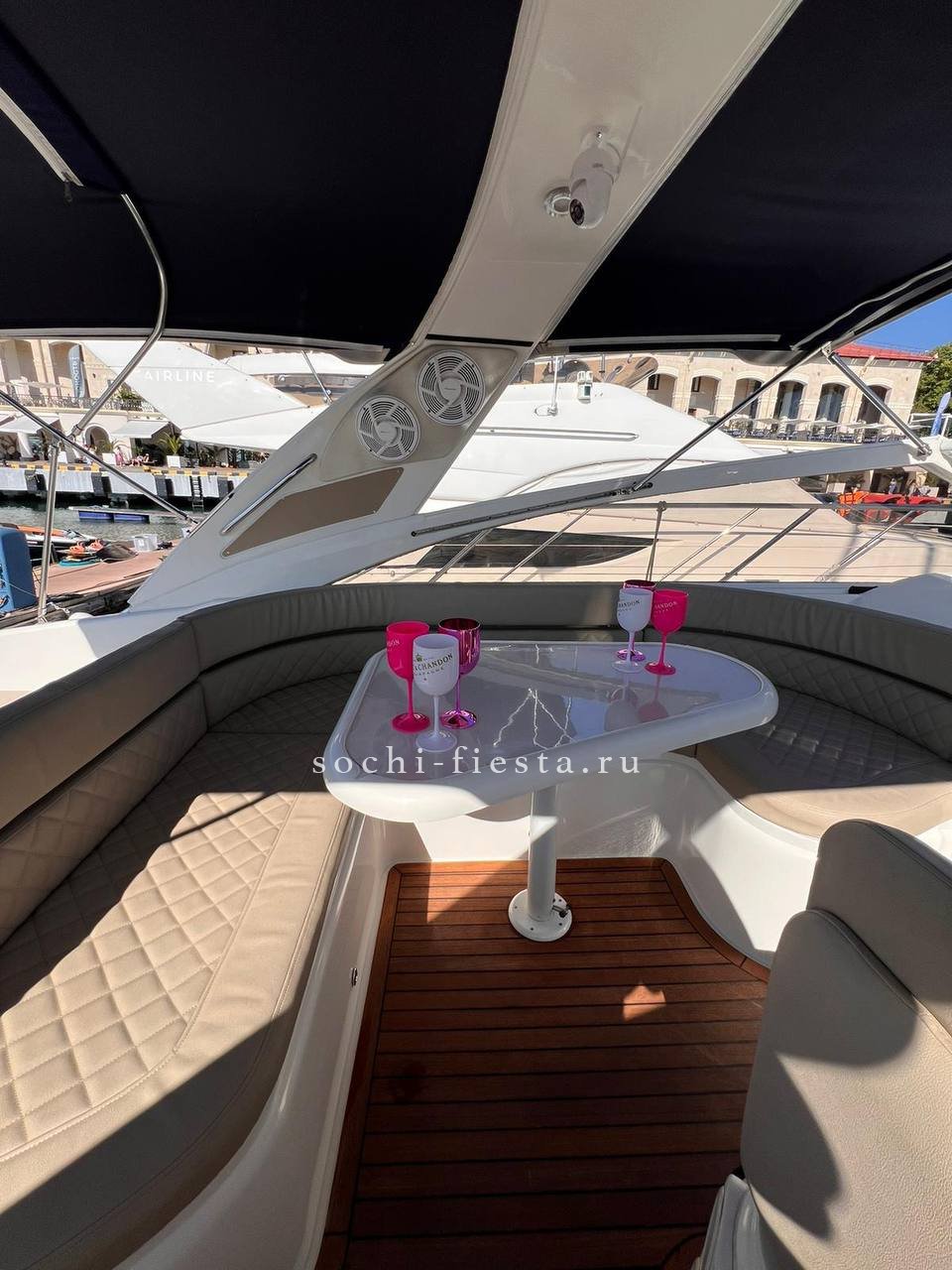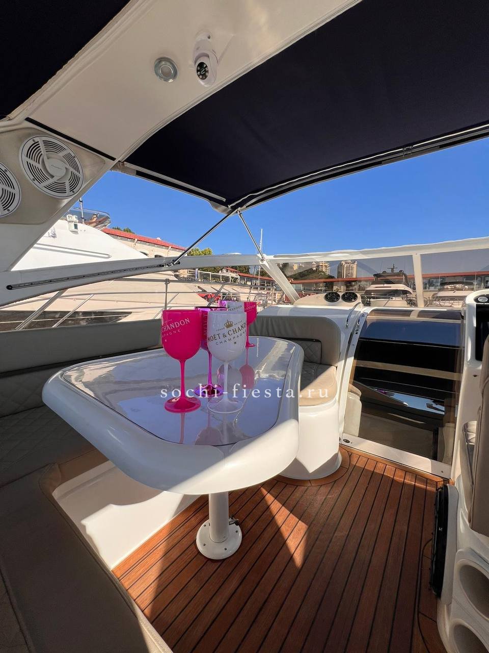 Оборудование: гостевая зона за столом на диванах + задняя зона для загара , закрыто тентом от солнца и окнами от ветра , палуба и купальная платформа покрыта тиком , раковина и кормовой душ х/г вода (пресная), на носу большая подушка для загара , две каюты (4-6чел) , туалет с душем , кухня с приборами, холодильник 2 шт, музыка премиум-класса ( AUX, bluetooth ) 2 киловатта звука, развлечения : сап-сёрф ,плюшка , жилеты , удочки , гидроциклы , вейк и т.д. по вашему желанию.